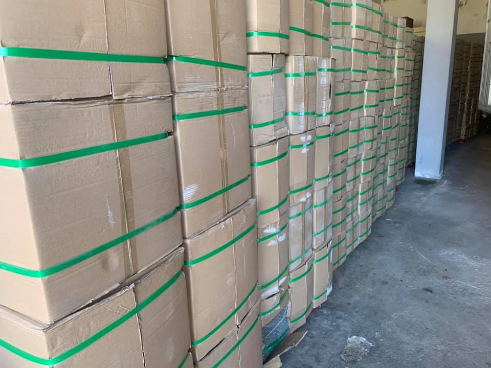 Caixas de cartão empilhadas com cintas verdes num armazém