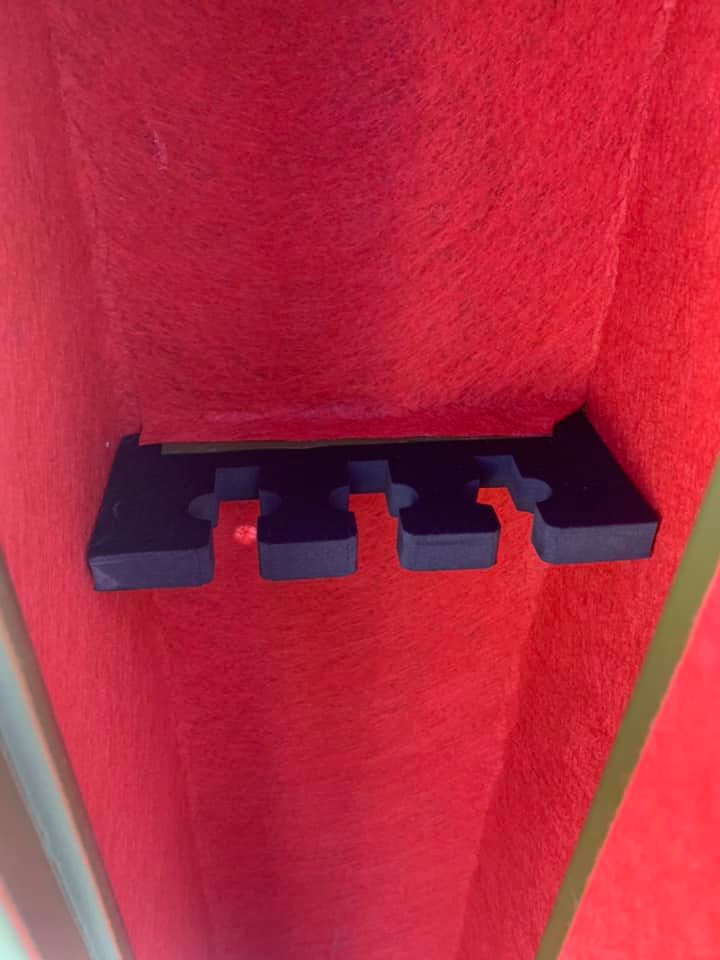Estrutura interna vermelha aveludada com peça preta de espuma com recortes
