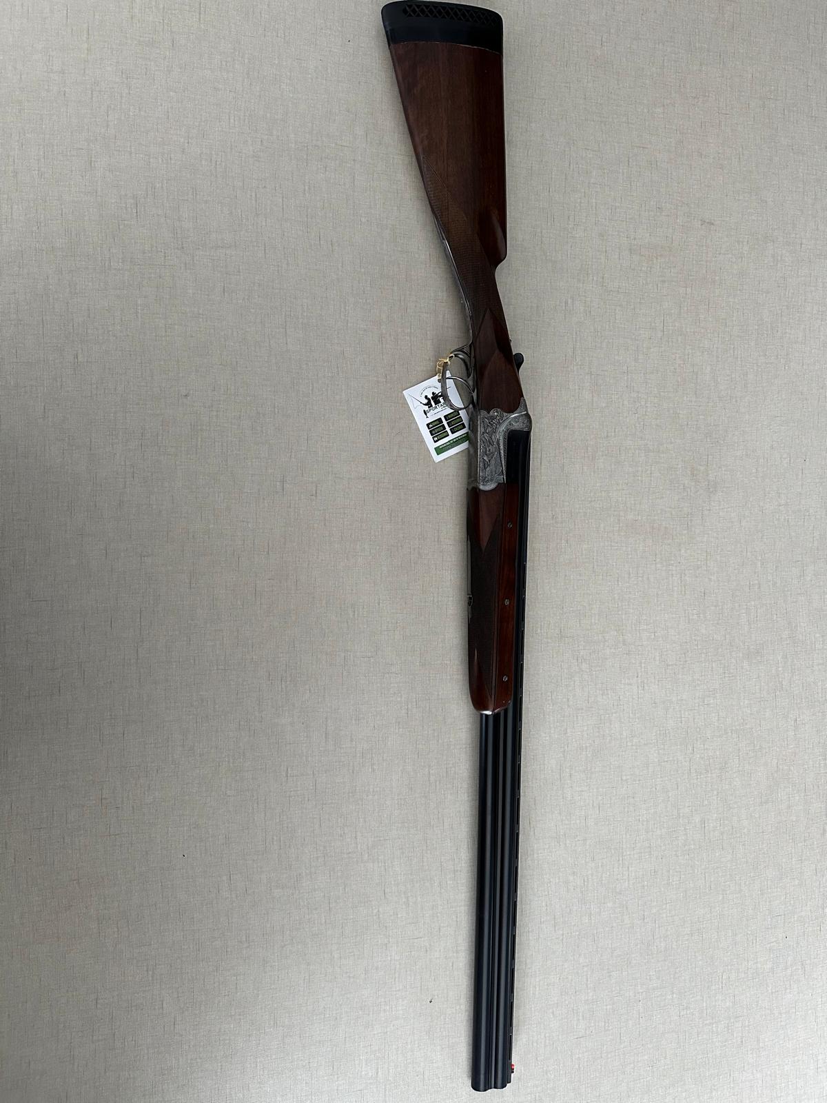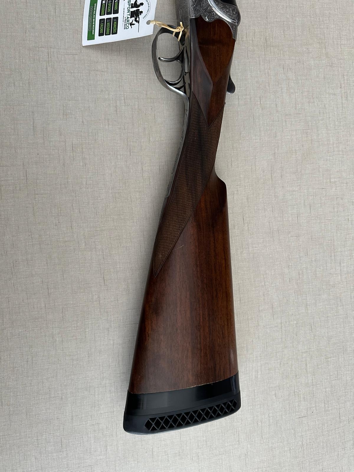 Espingarda de cano duplo com madeira castanha e canos pretos