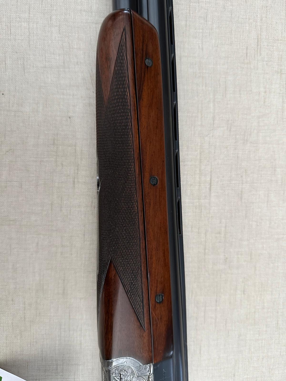 Parte da espingarda com madeira castanha, parafusos pretos e metal prateado com gravuras