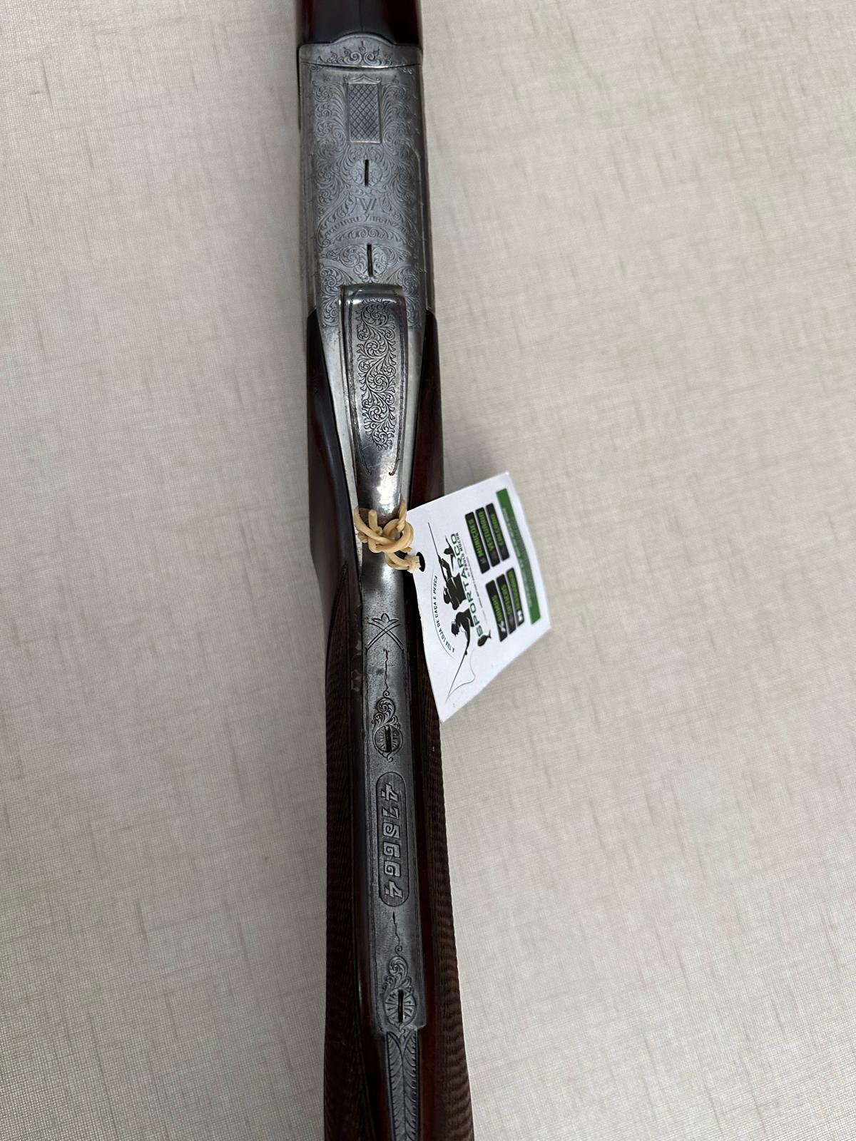 Espingarda com caixa metálica gravada e coronha de madeira em tecido bege