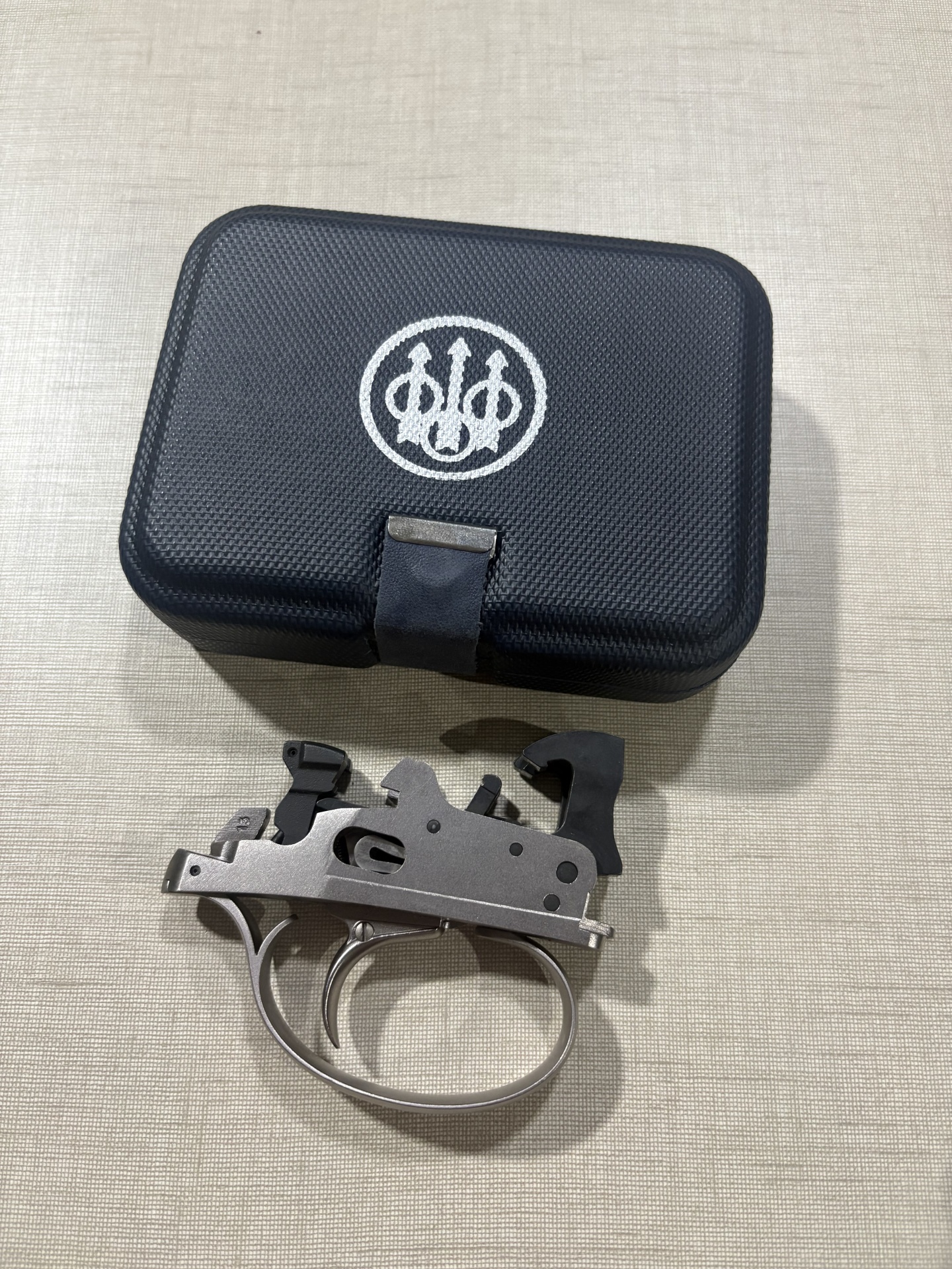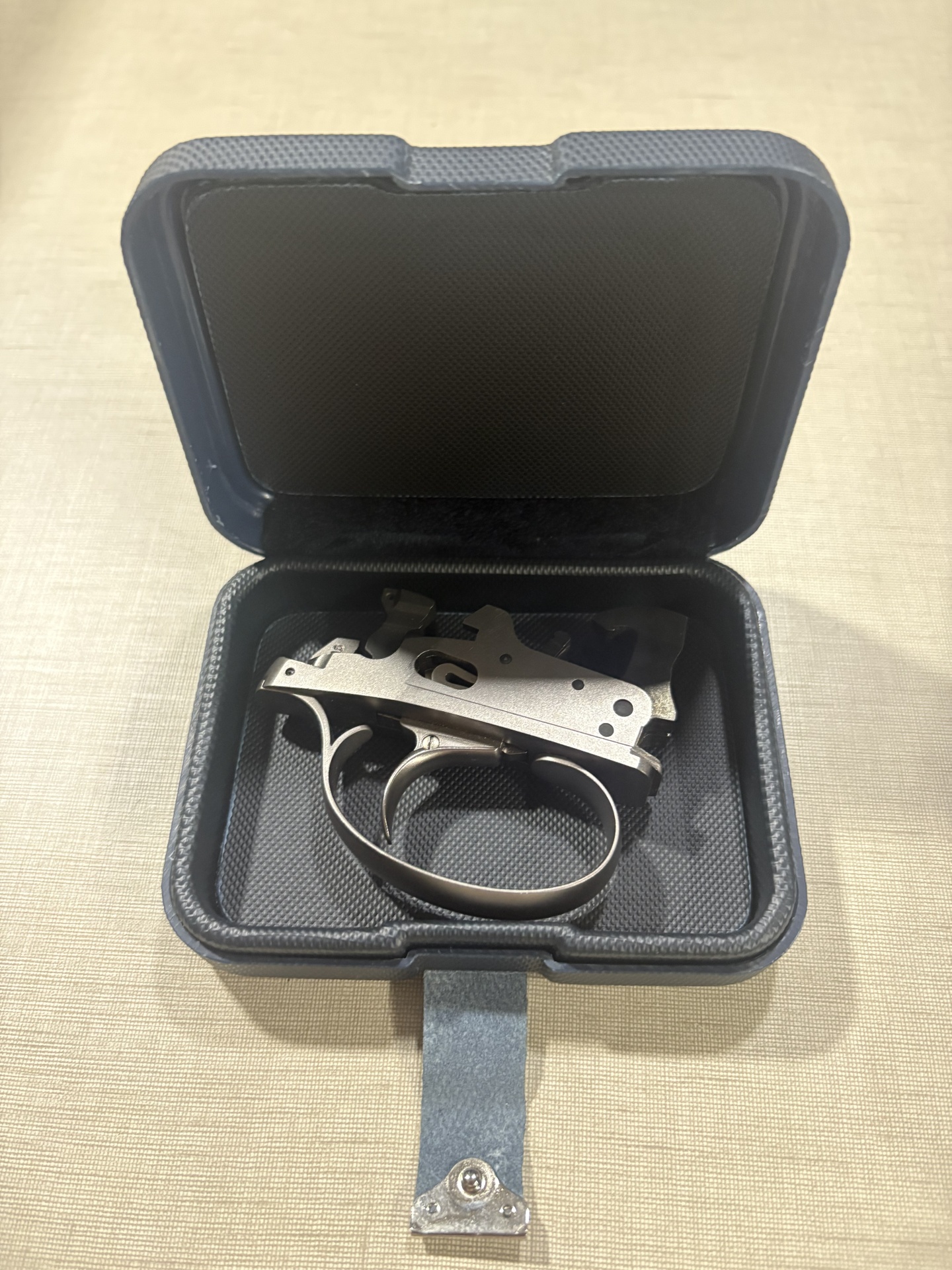 Mecanismo de arma dentro de caixa azul aberta em superfície bege.