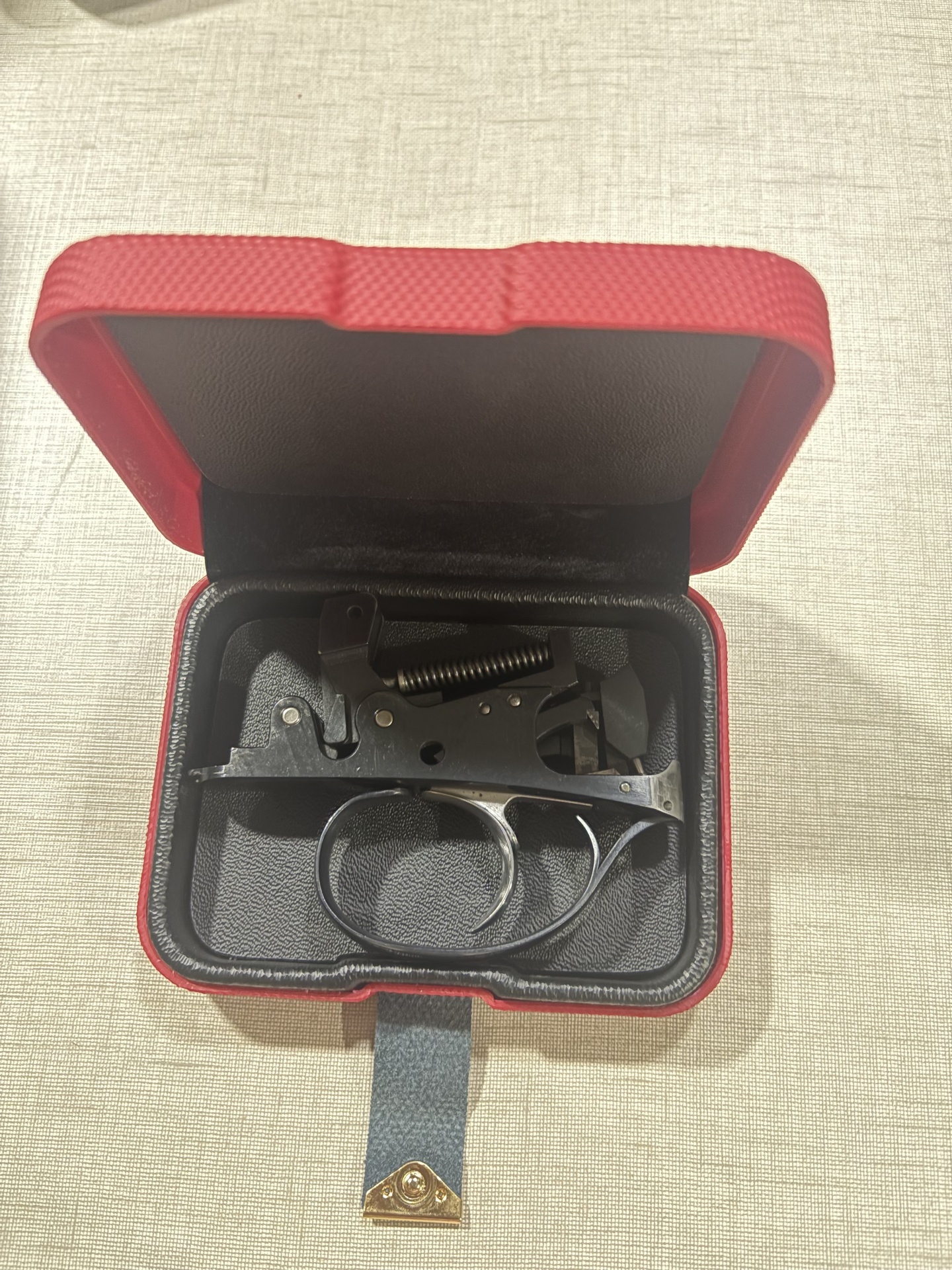 Mecanismo de gatilho metálico preto em estojo vermelho aberto sobre tecido bege