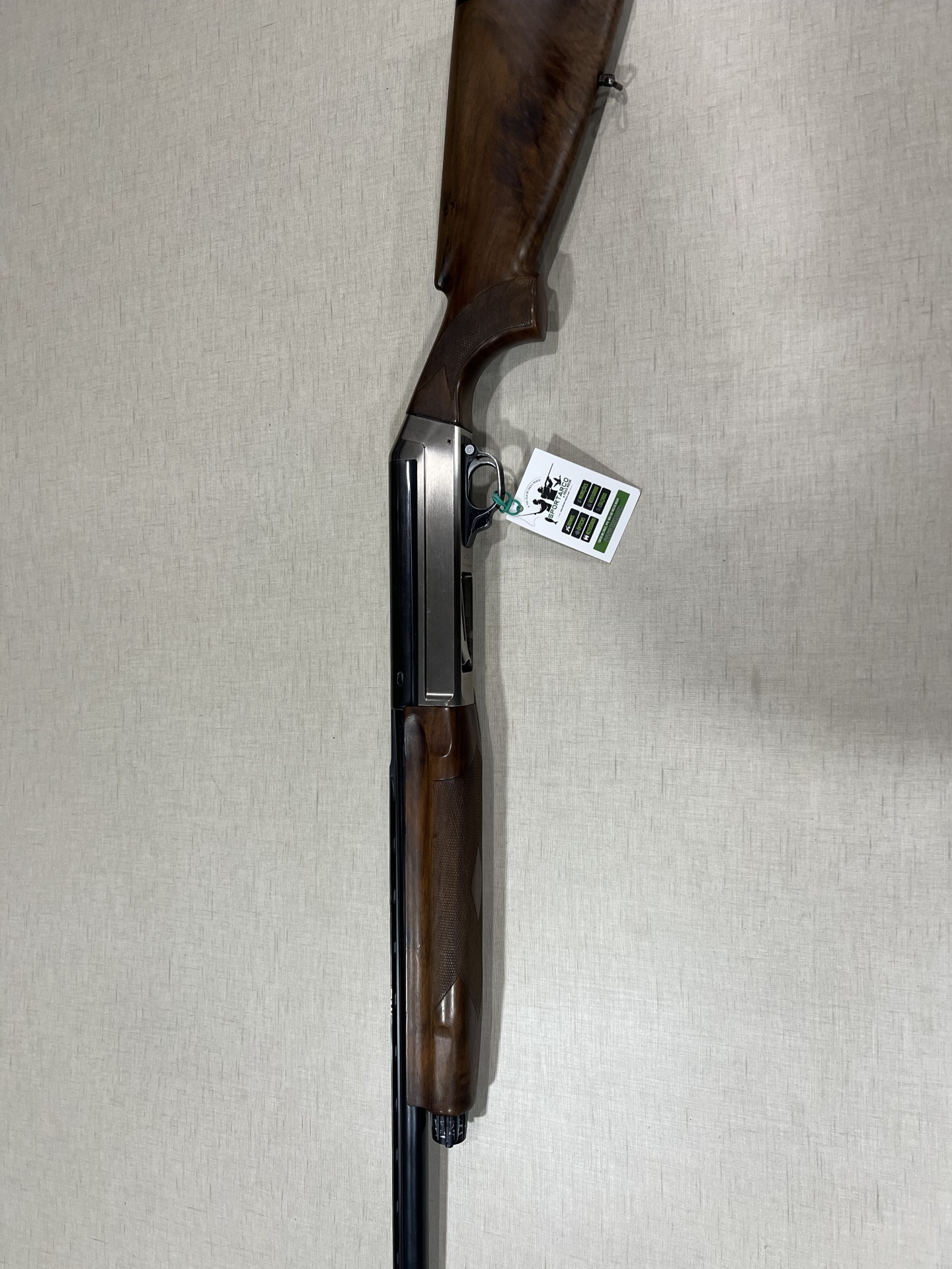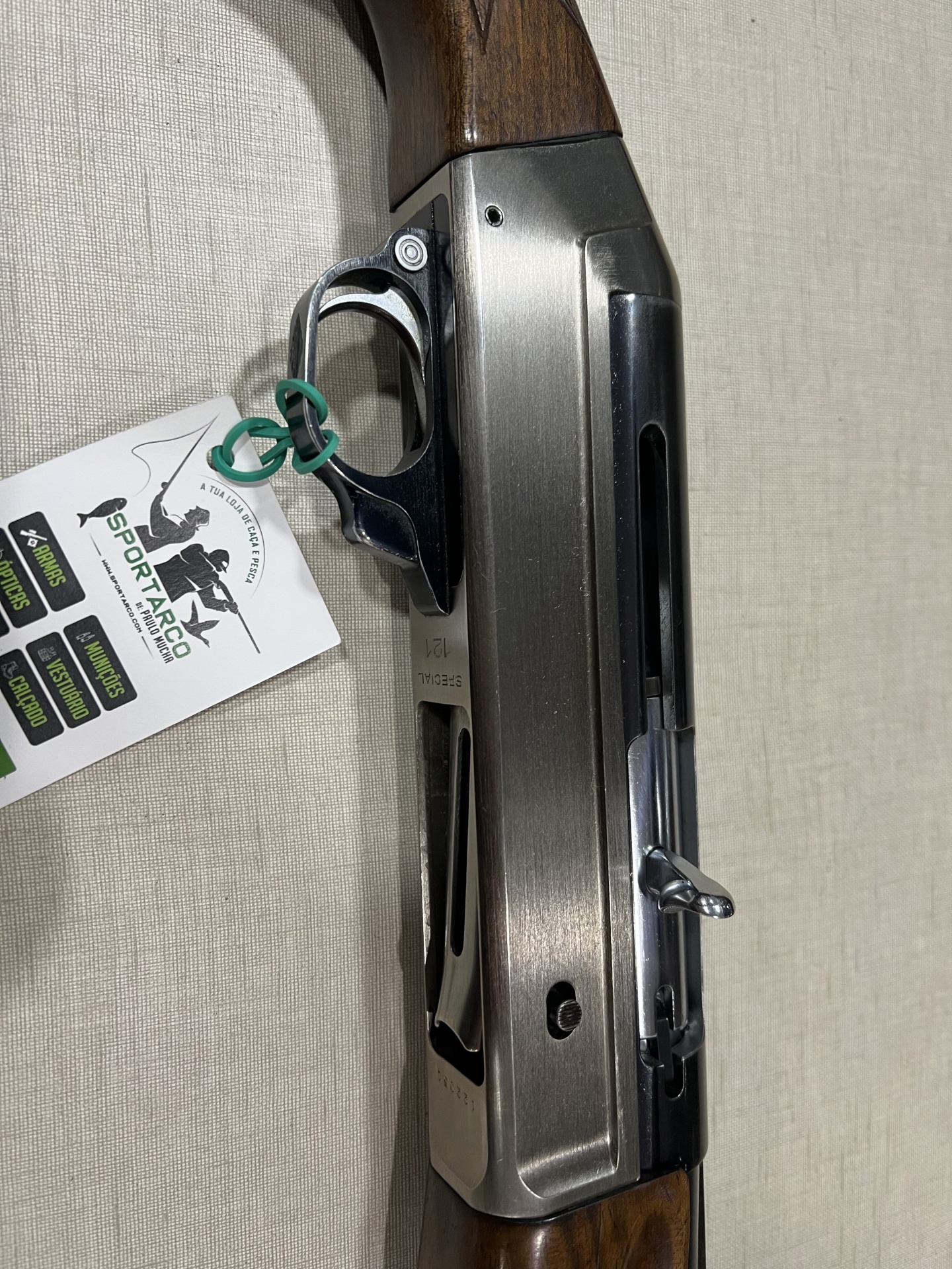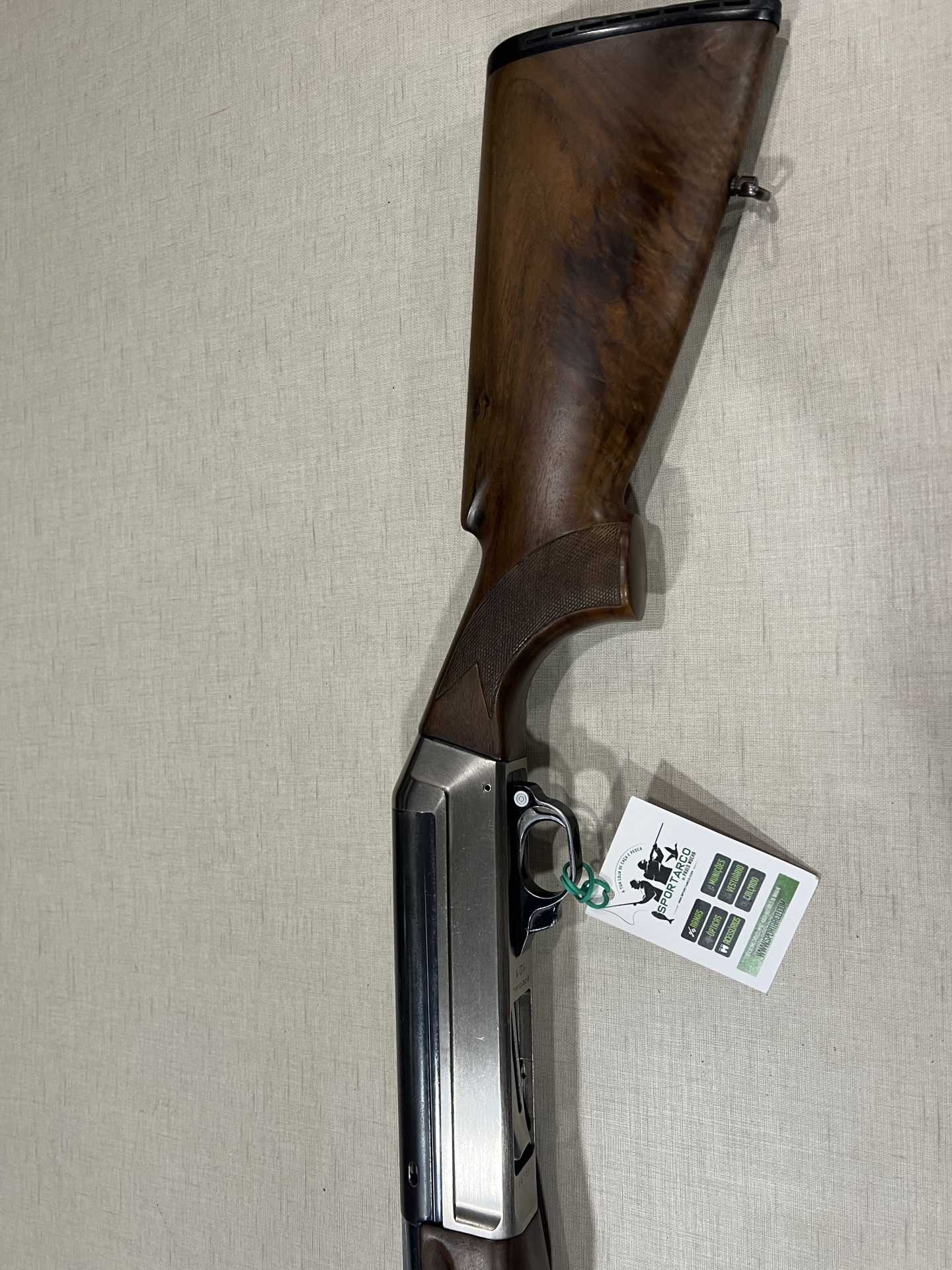 Espingarda de madeira e metal com etiqueta pendurada sobre fundo bege