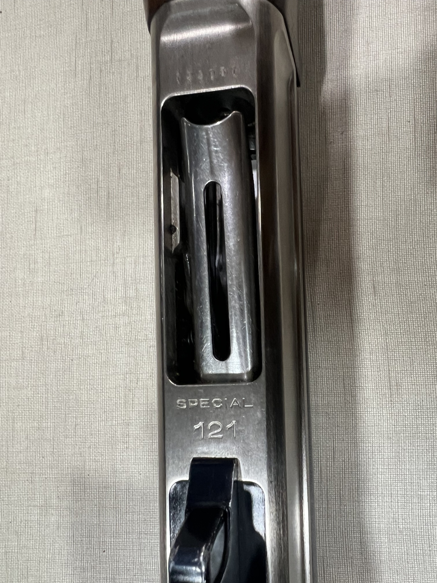 Parte de arma metálica prateada com inscrições SPECIAL 121