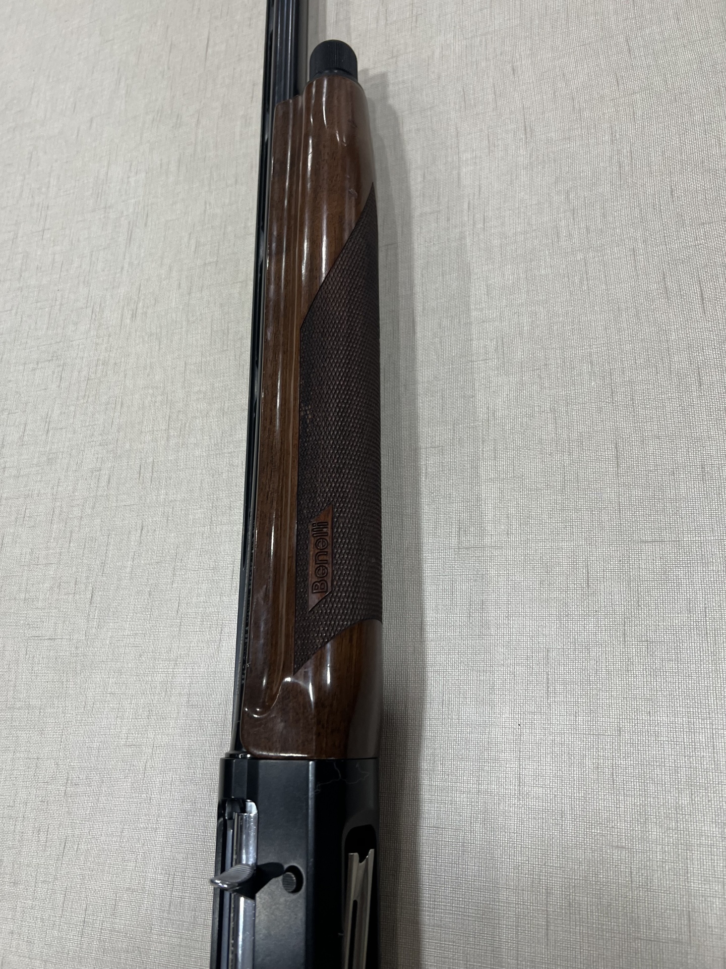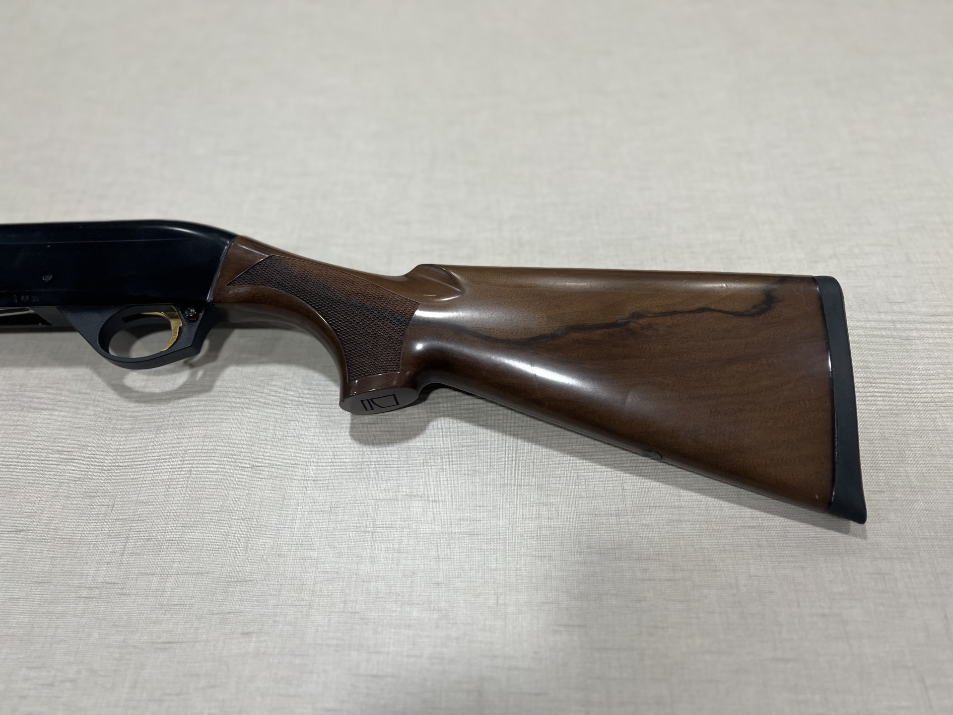 Espingarda com coronha de madeira castanha e empunhadura texturizada em superfície bege