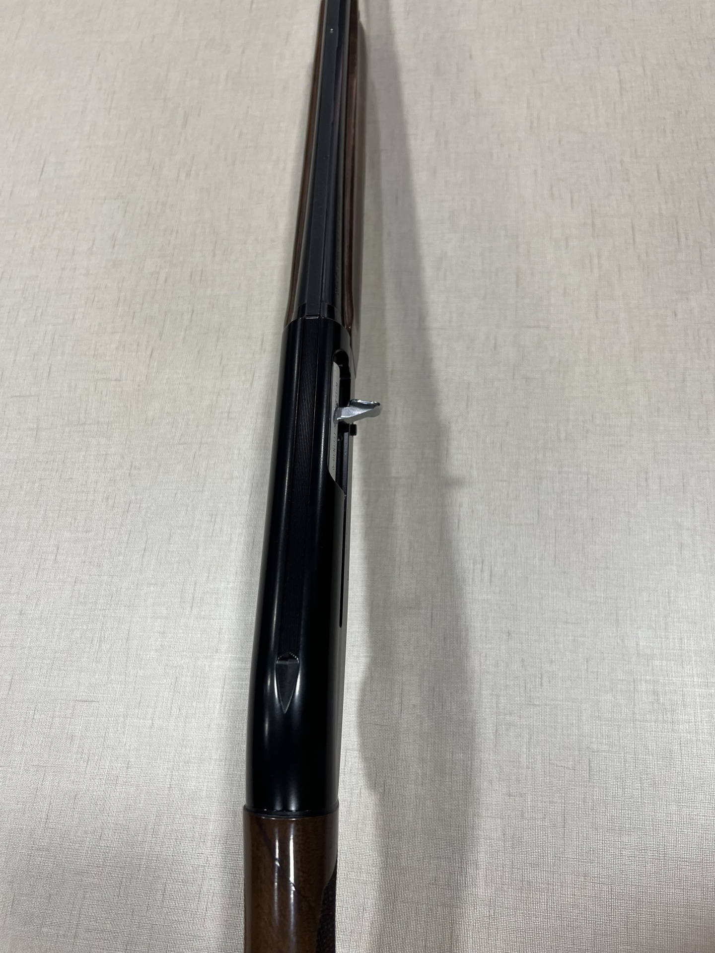 Espingarda com madeira castanha e metal preto sobre superfície clara