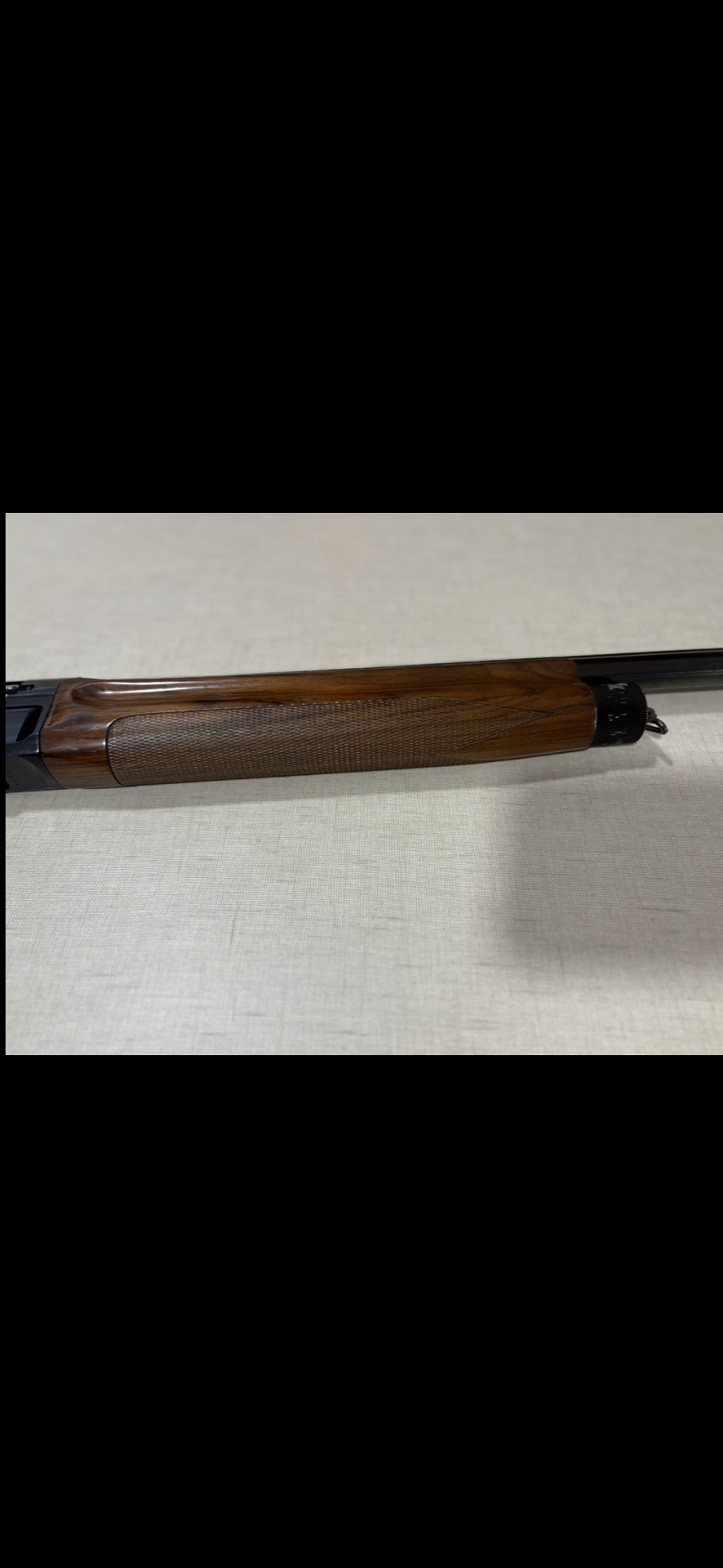 Espingarda com caixa preta e coronha de madeira castanha escura