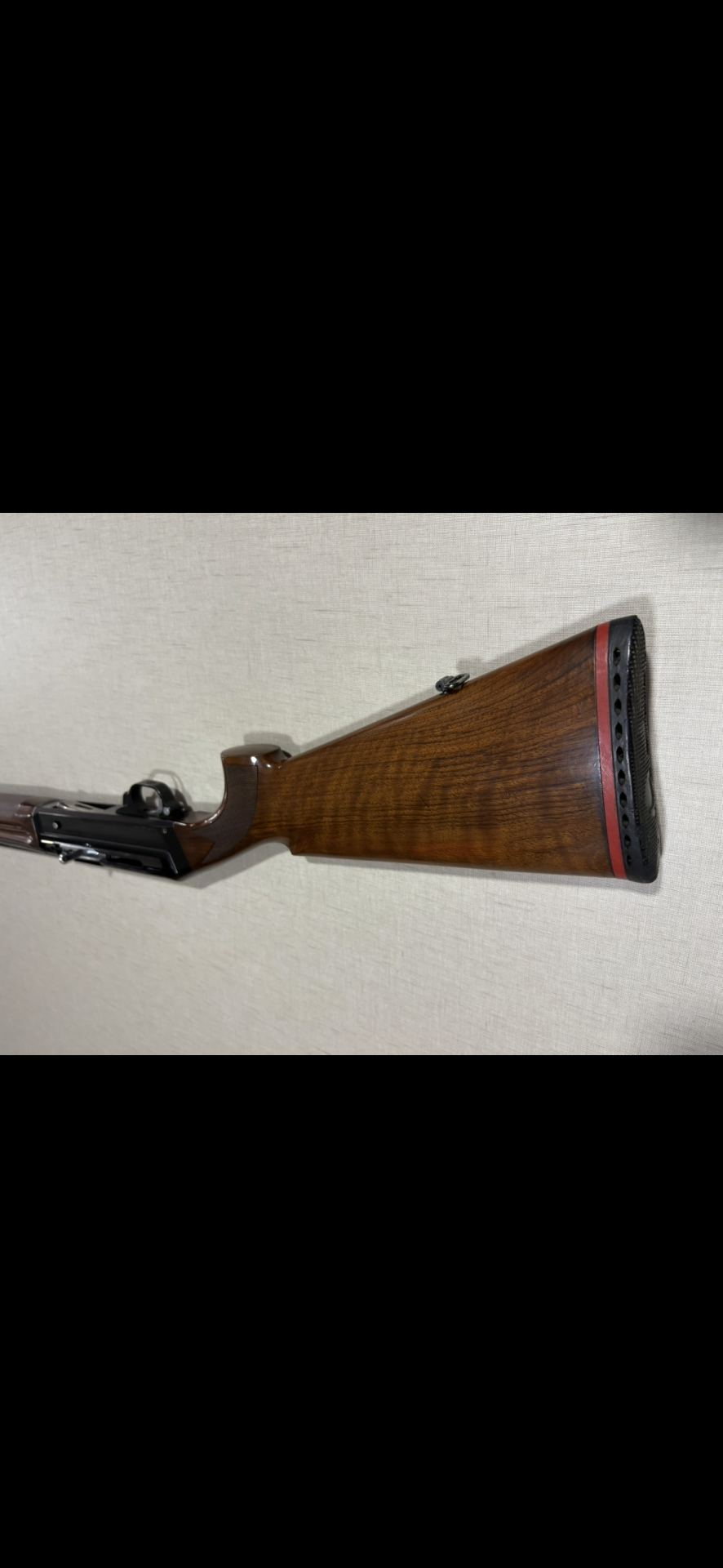 Espingarda com coronha em madeira castanha polida encostada a parede