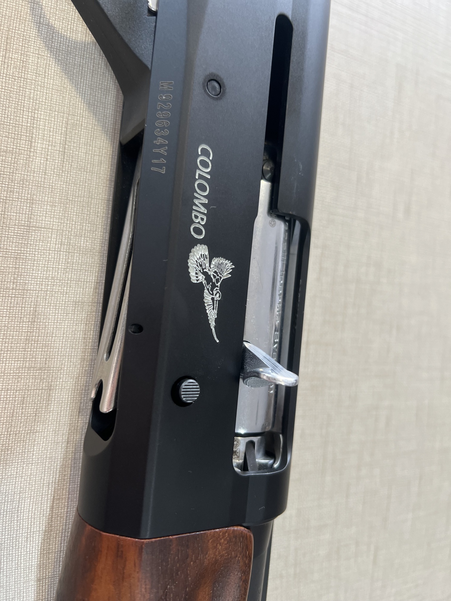 Parte de espingarda metálica preta com cabo de madeira castanha e texto COLOMBO