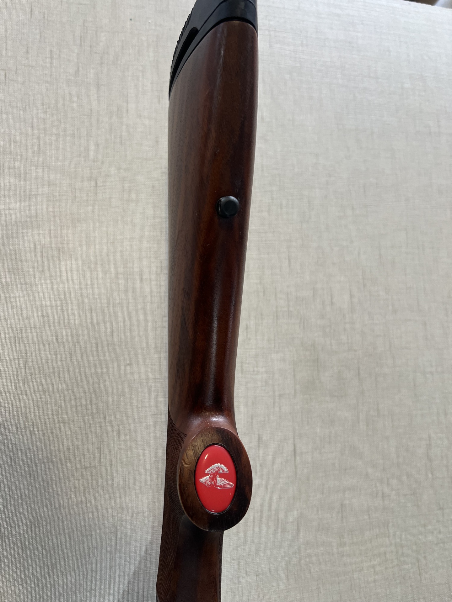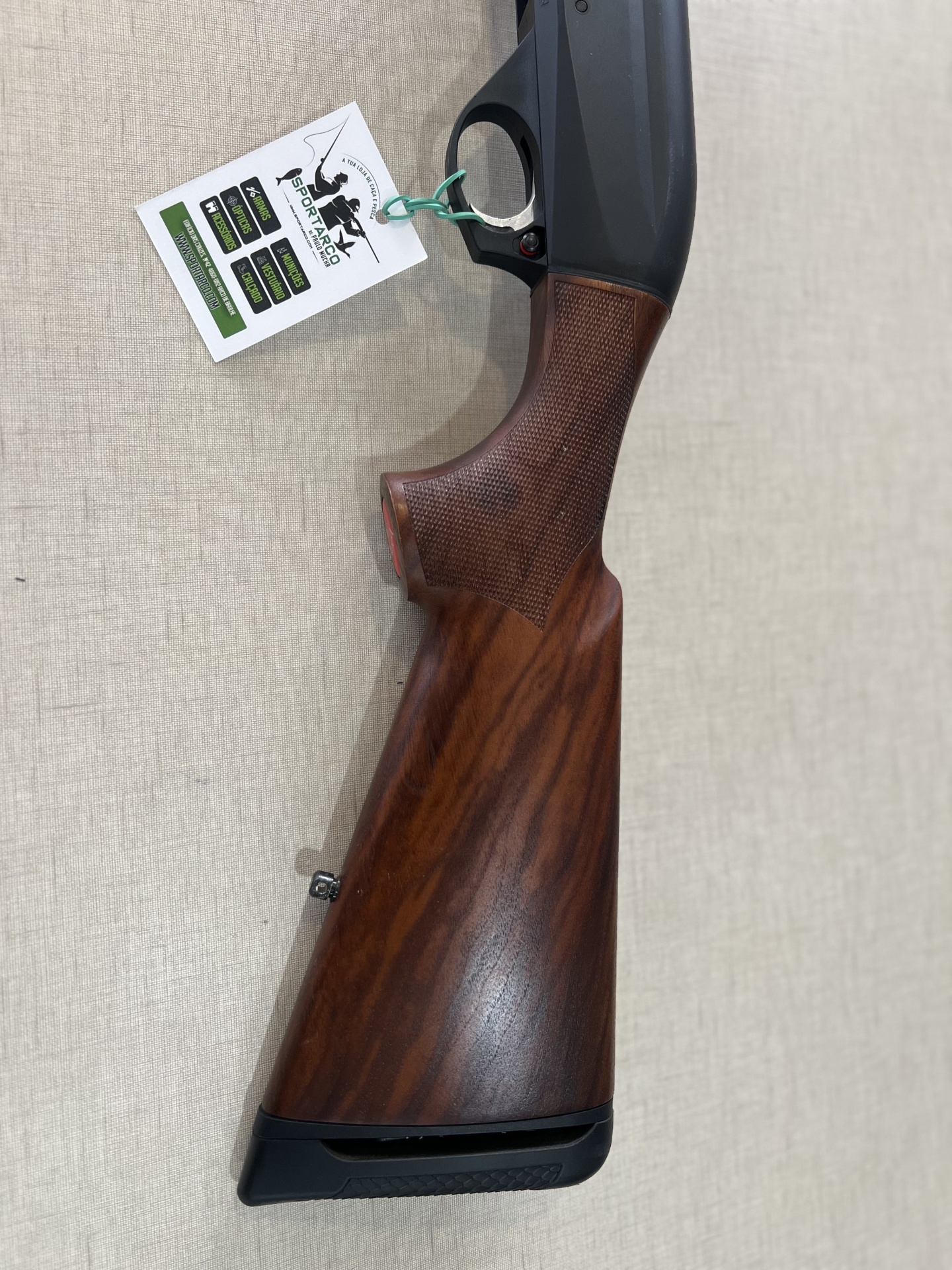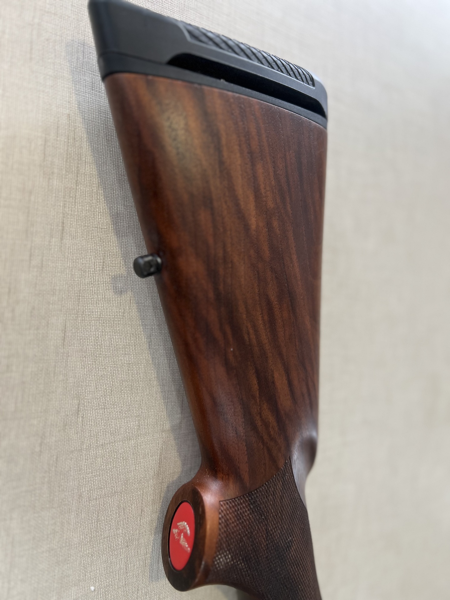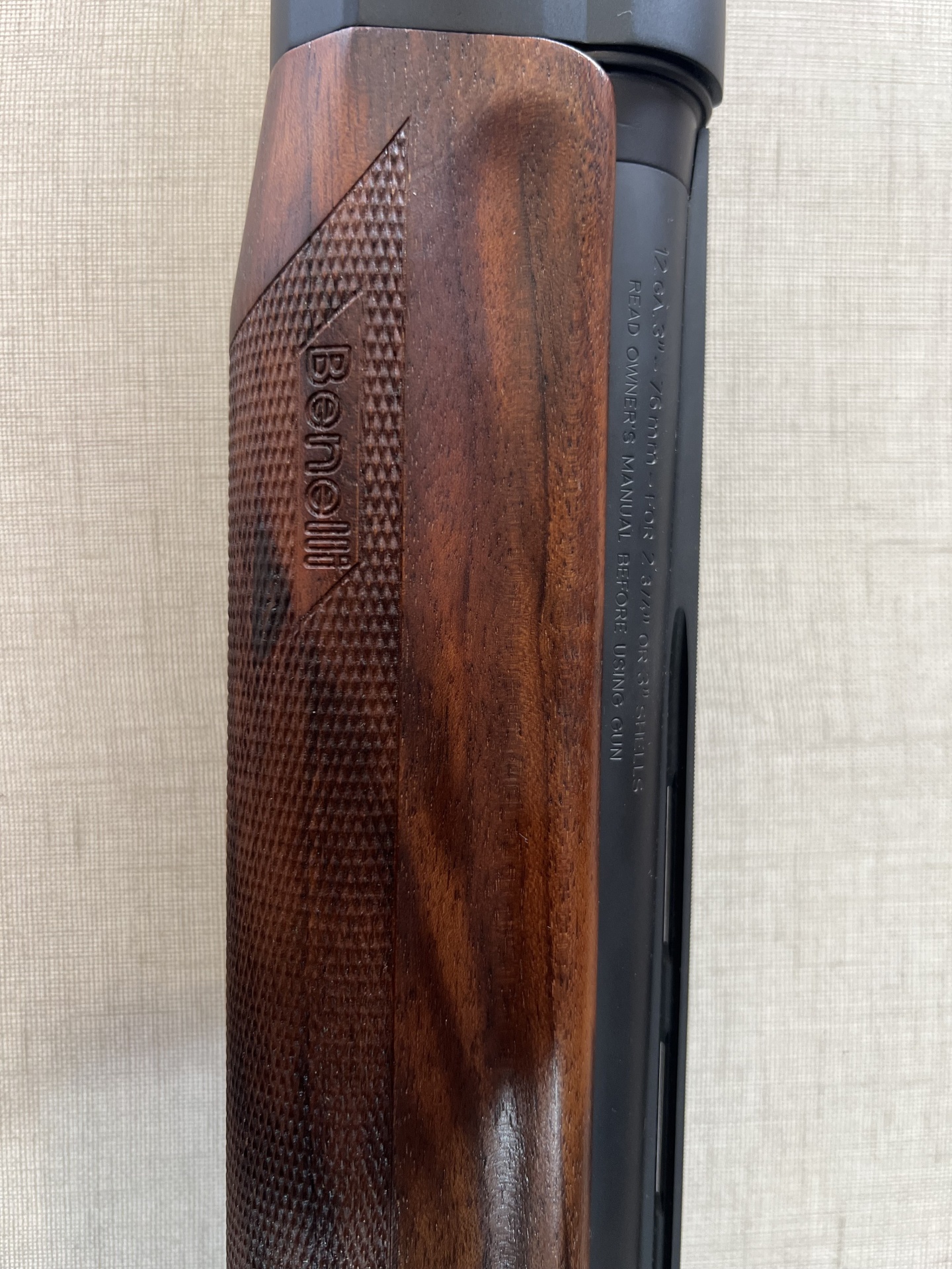 Detalhe de empunhadura em madeira com logo Benelli em arma de fogo