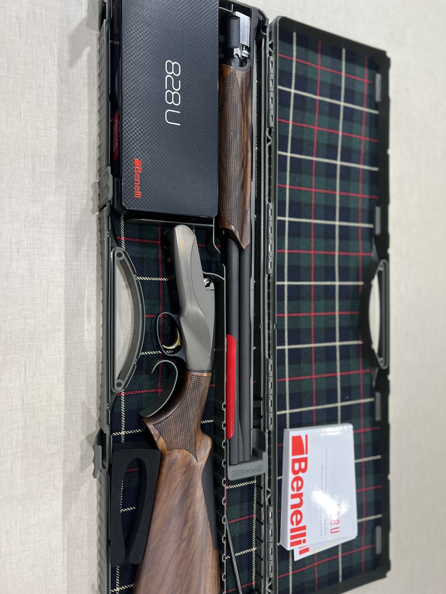 Espingarda desmontada em estojo com padrão xadrez e caixa preta com texto Benelli