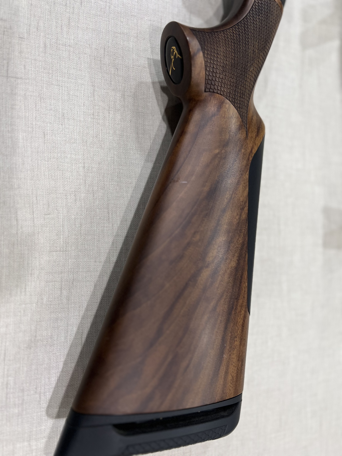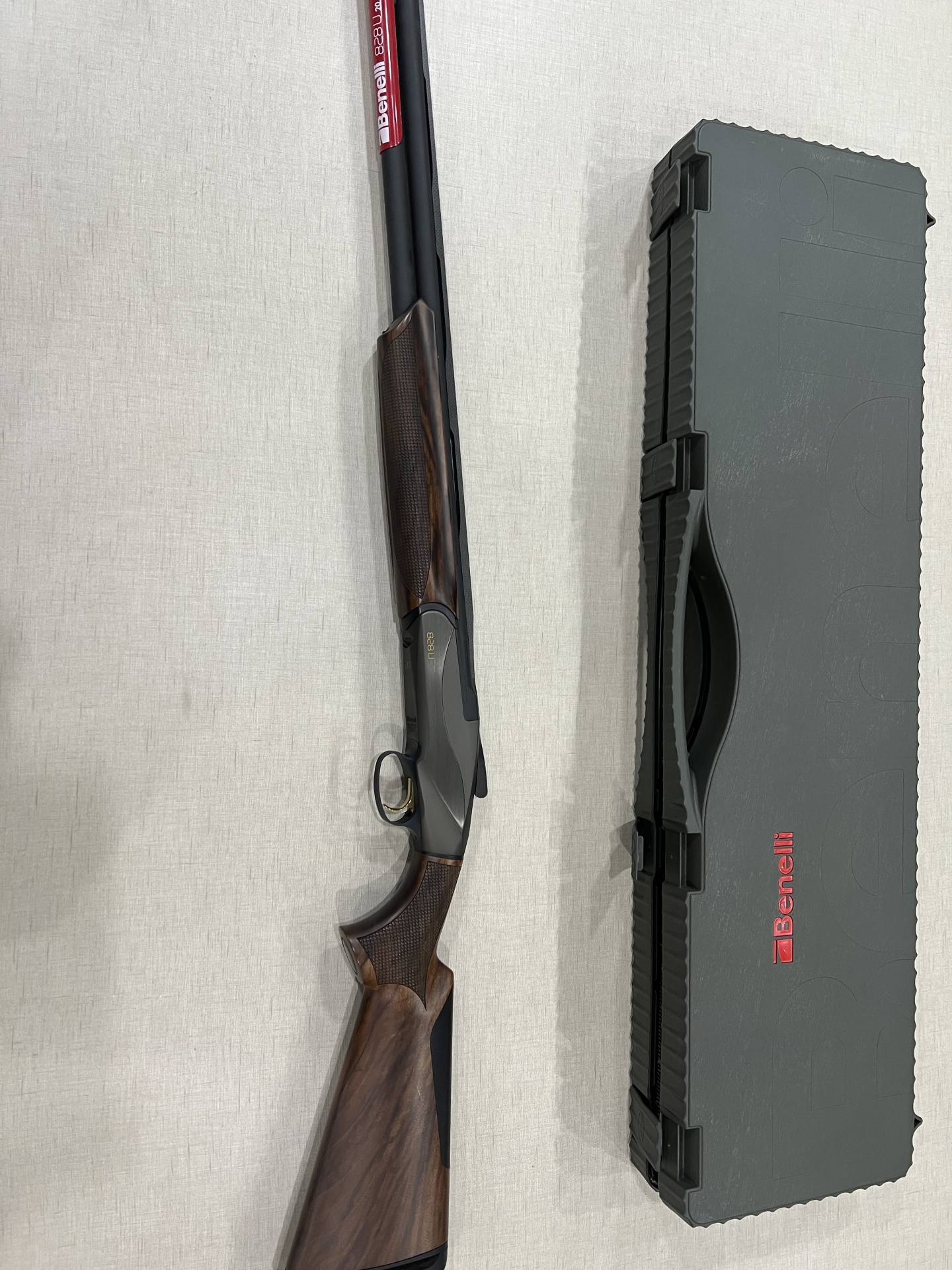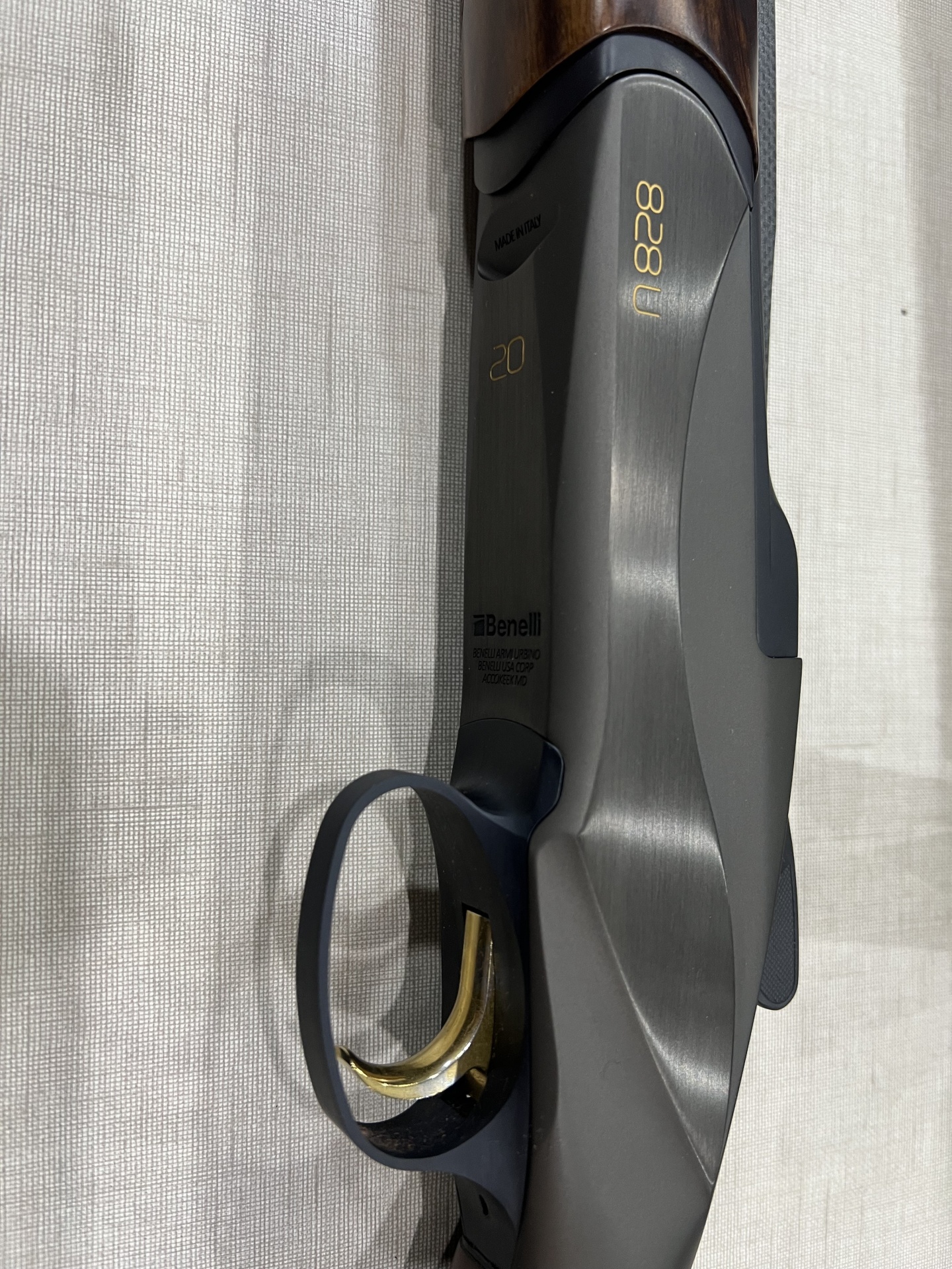 Parte de uma espingarda Benelli 828 U com punho em madeira e detalhes metálicos