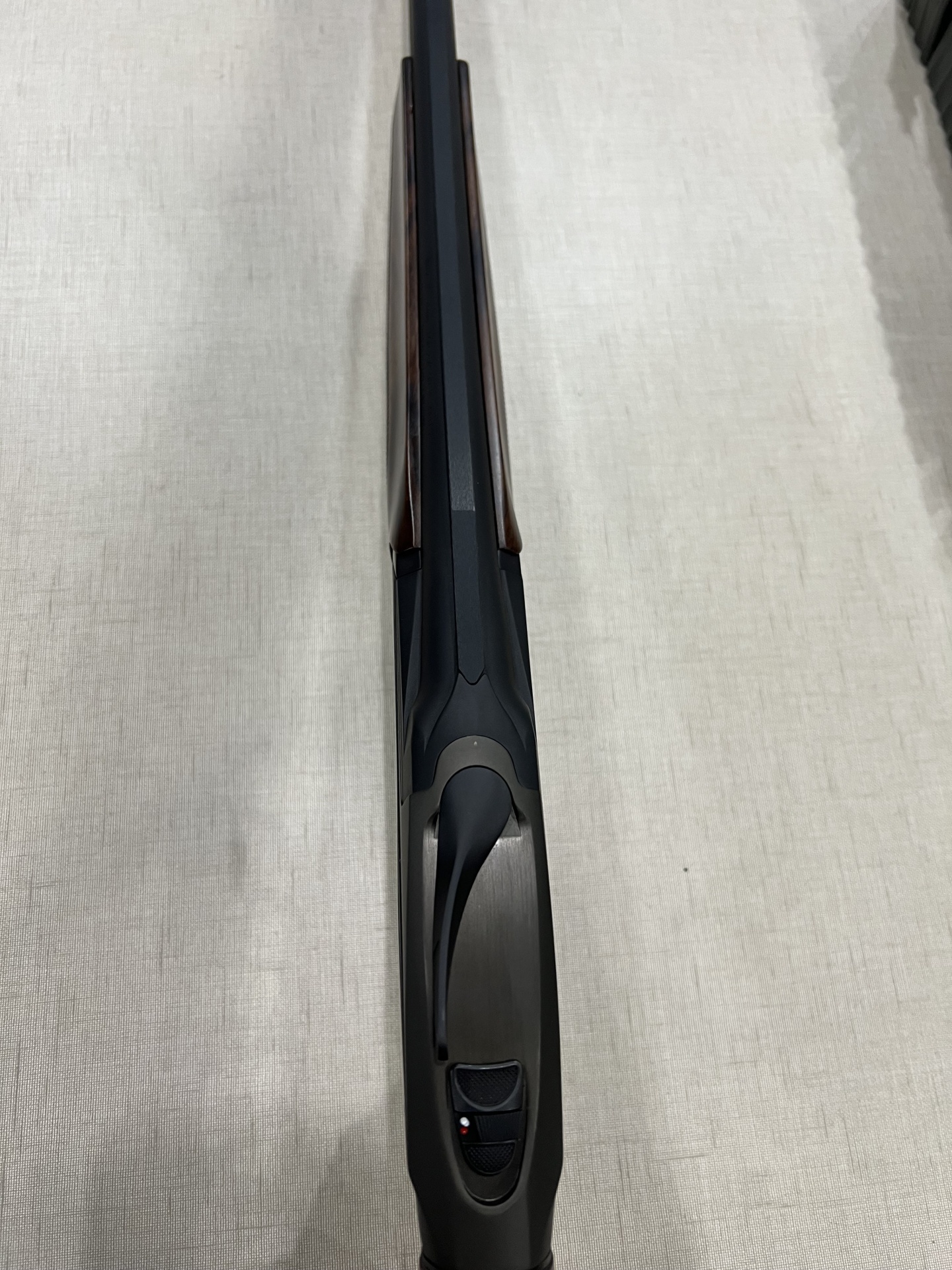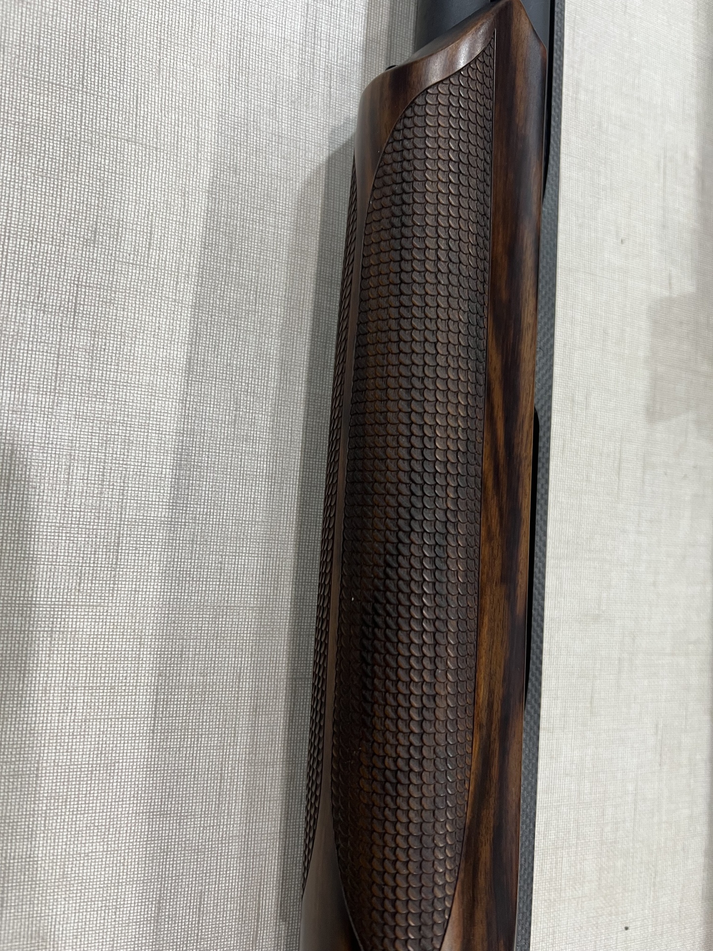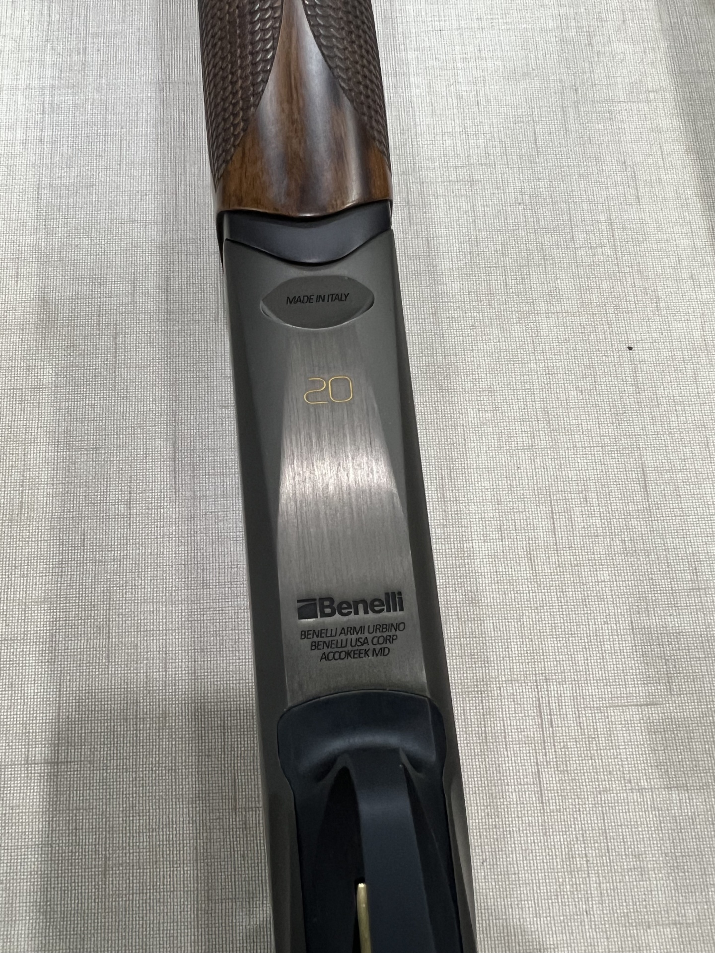 Parte de uma espingarda Benelli 828 U com punho em madeira e detalhes metálicos