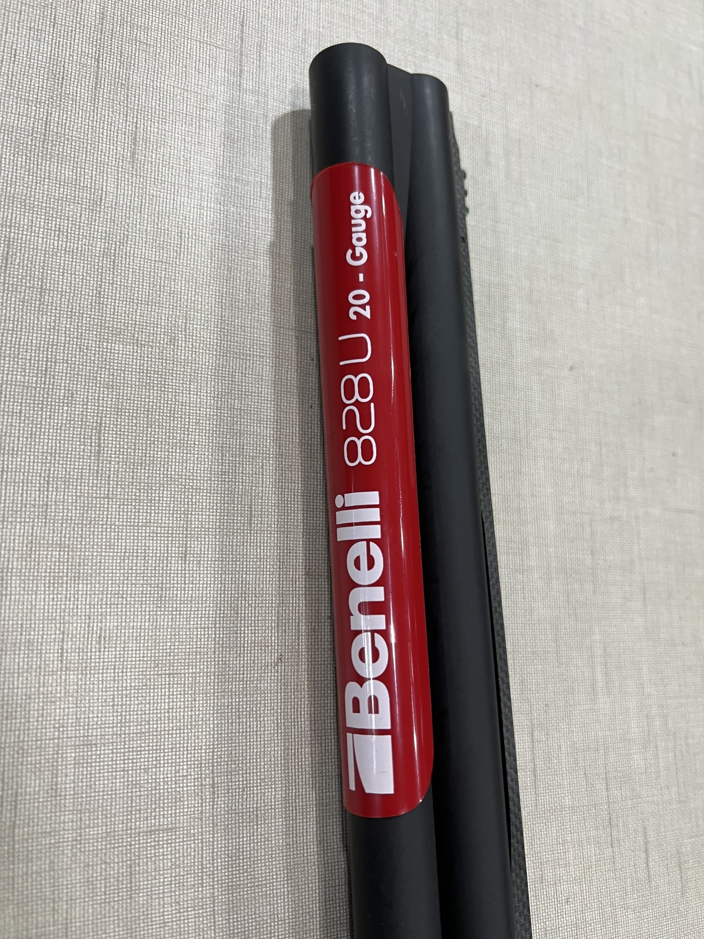 Dois tubos pretos com etiqueta vermelha e texto branco Benelli 828U 20 Gauge