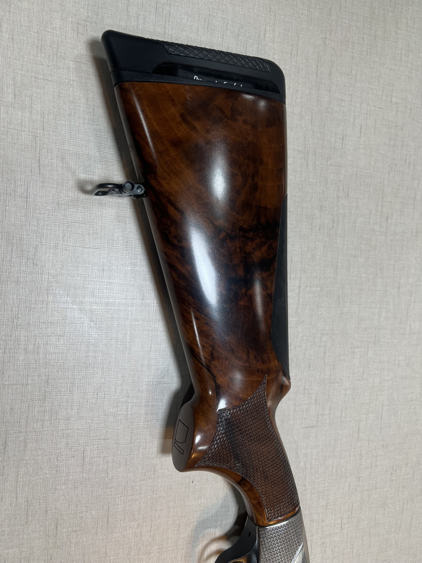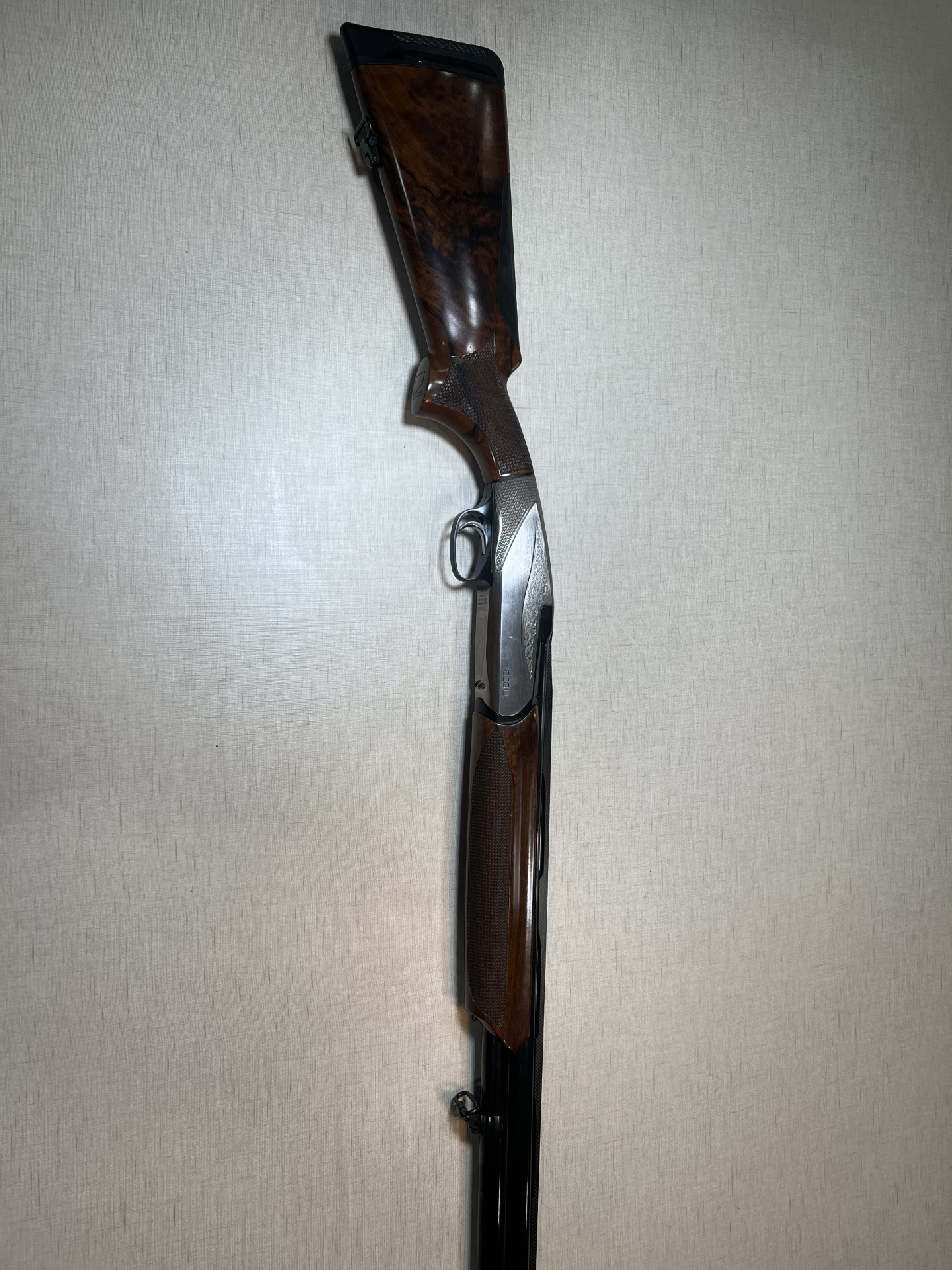 Espigão de arma de fogo em madeira castanha e preto, apoiado numa parede clara