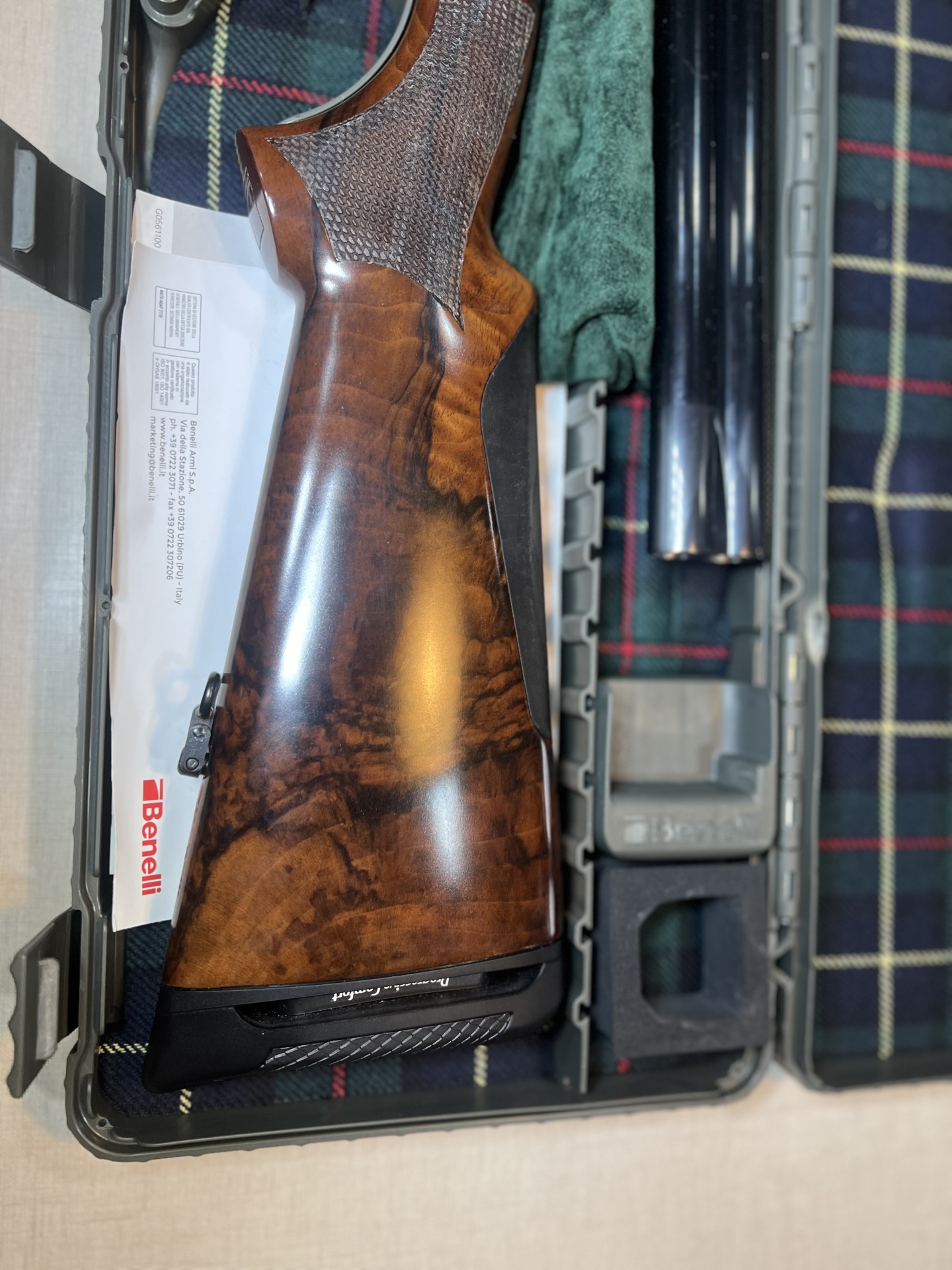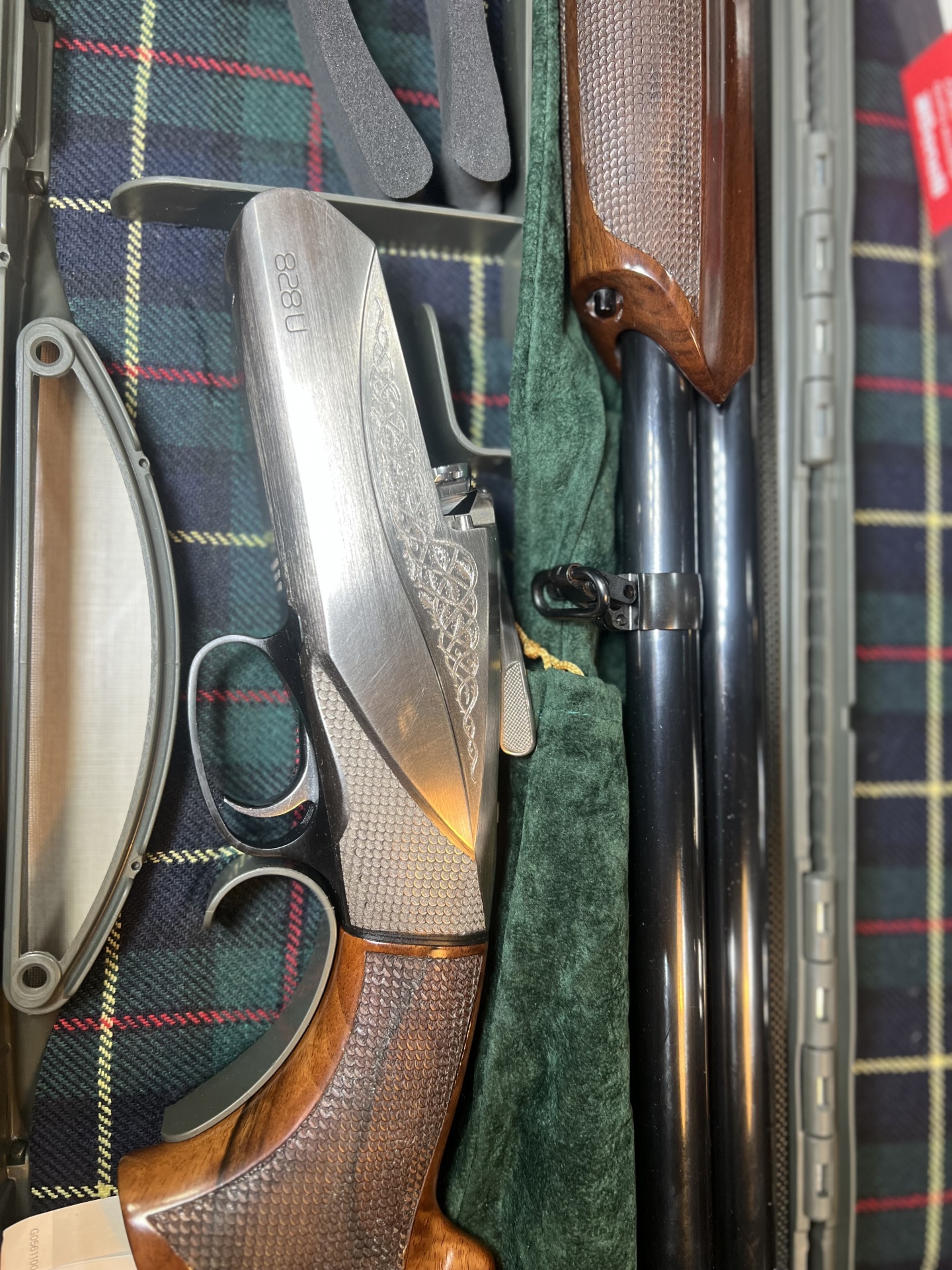 Espingarda desmontada com acessórios numa mala cinzenta forrada a padrão tartan