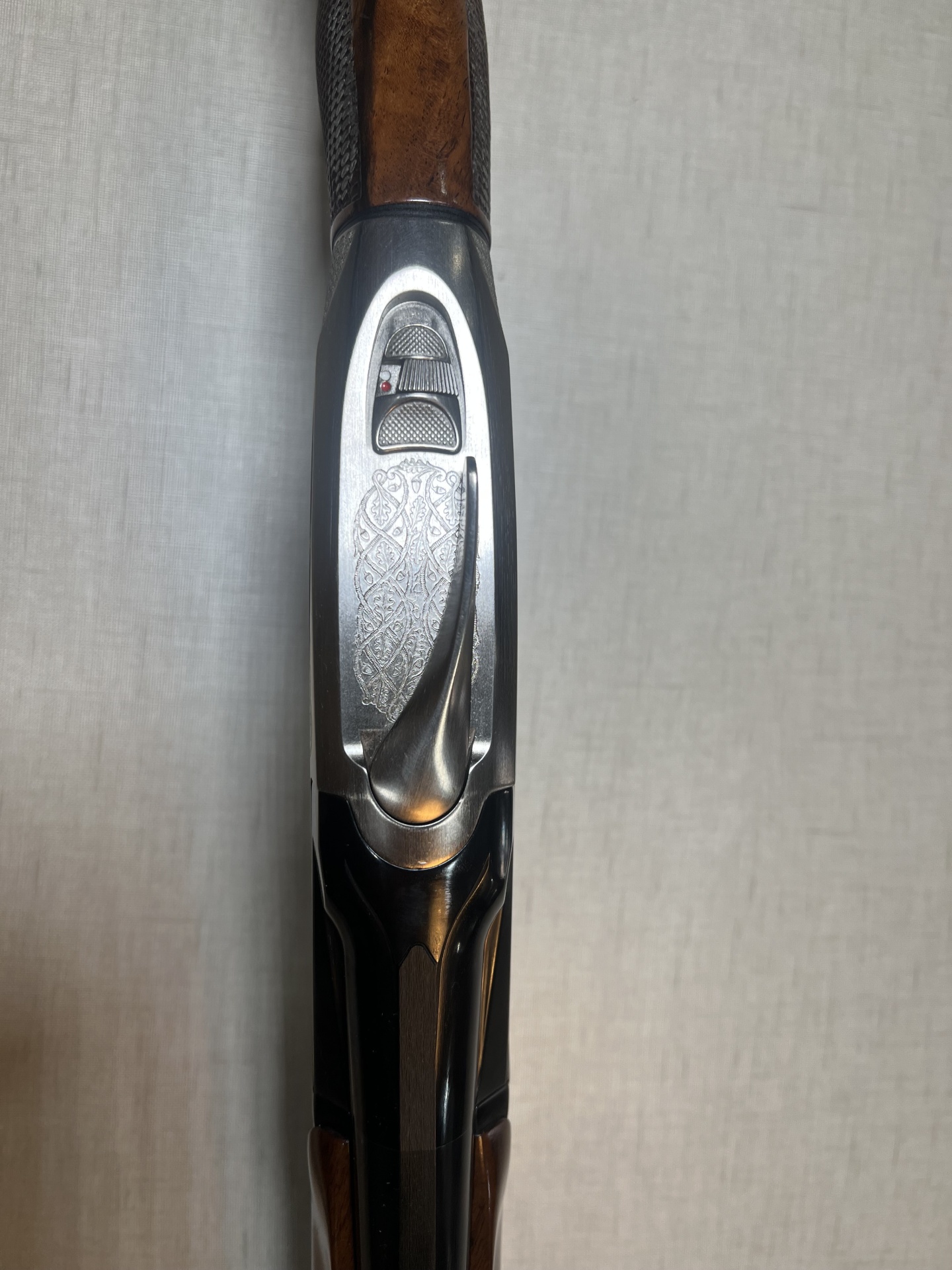 Espingarda de madeira e metal com detalhes gravados e número 18828 em fundo bege