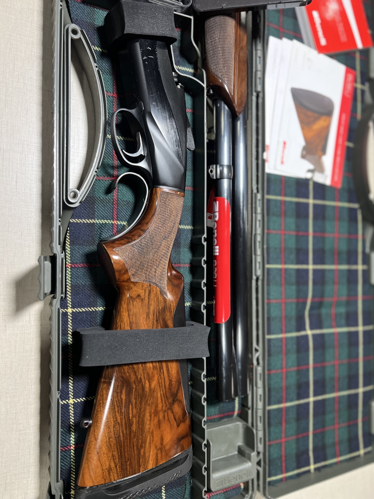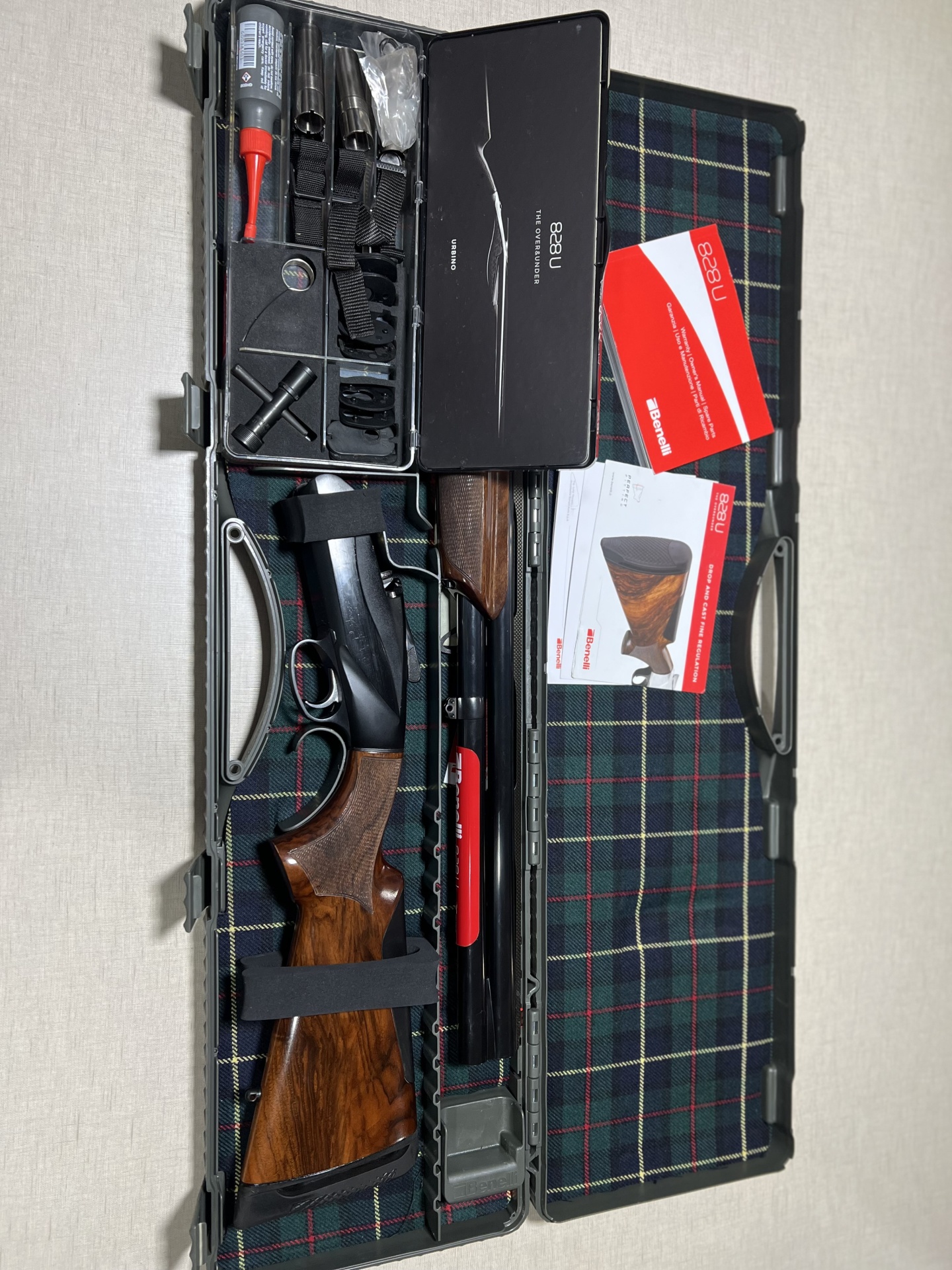 Estojo aberto com caçadeira desmontada, ferramentas e manuais