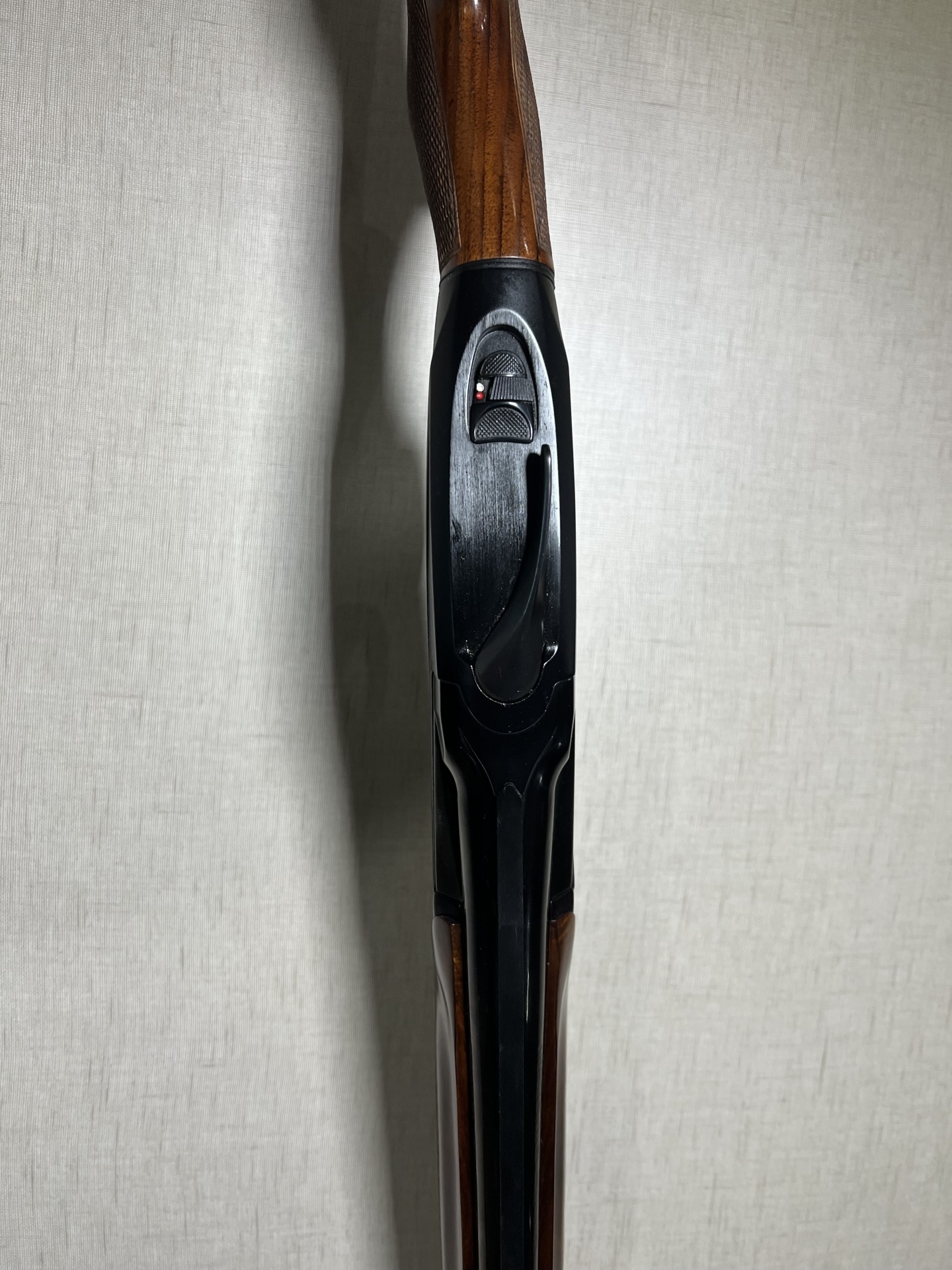 Espingarda de madeira e metal preto com seletor de segurança
