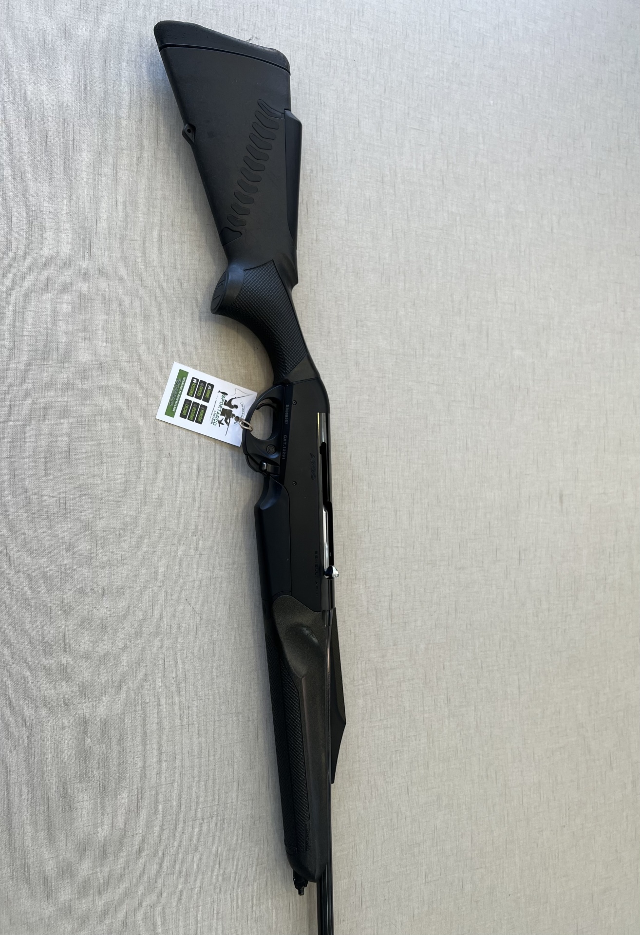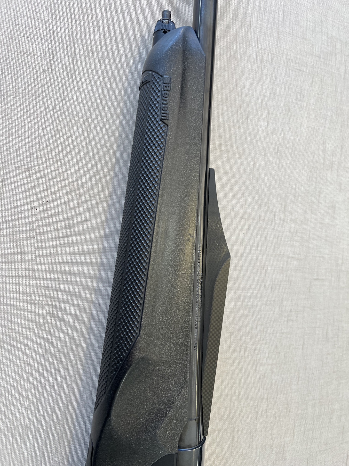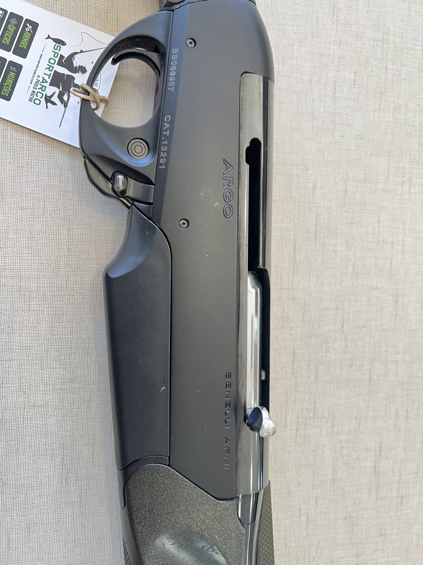 Espingarda Benelli Argo preta com etiquetas e código de barras sobre tecido bege