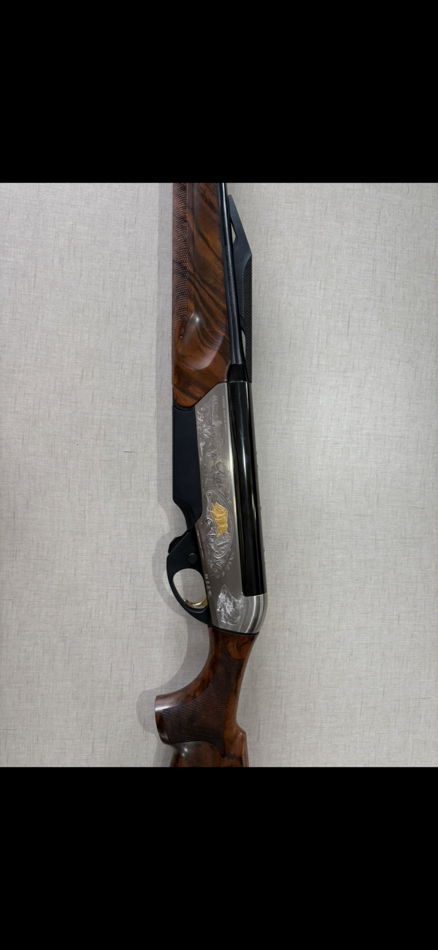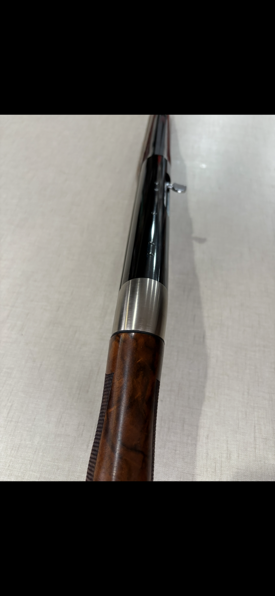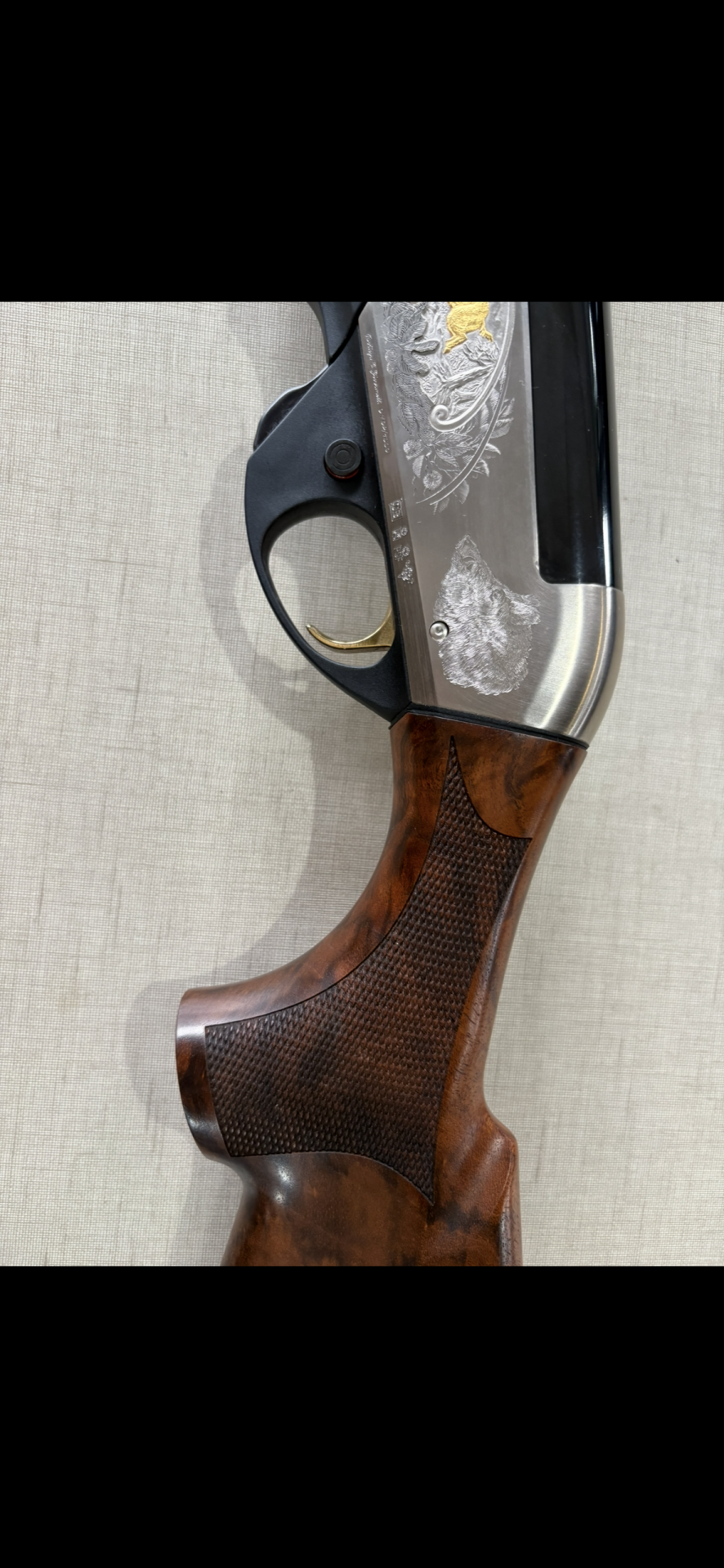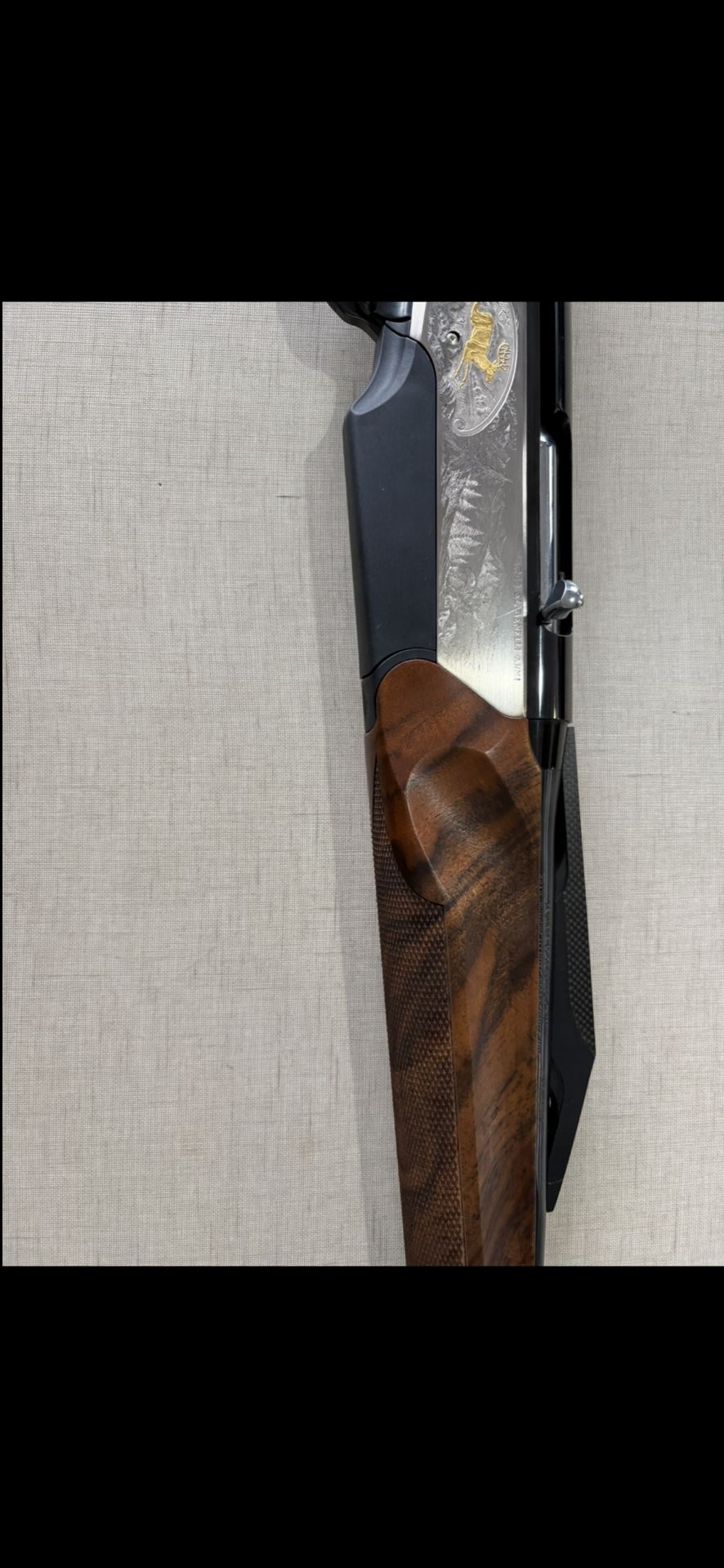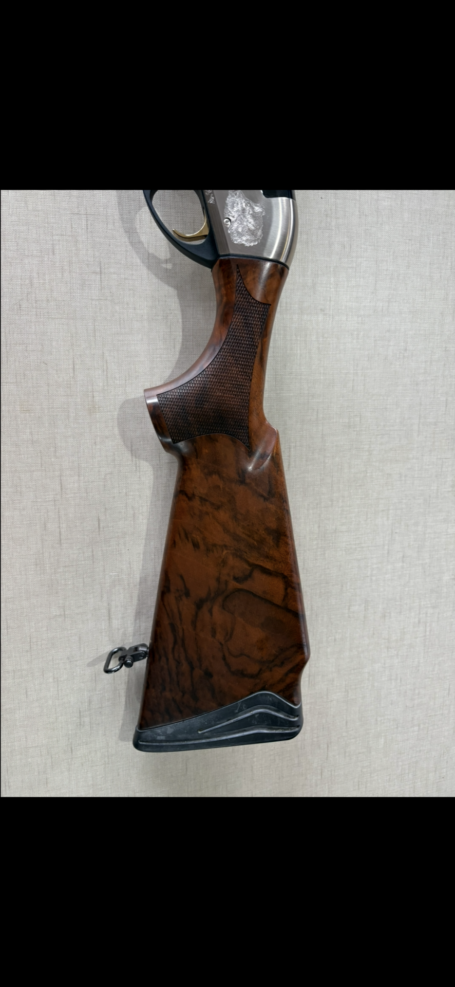 Coronha de arma de caça em madeira com detalhes metálicos prateados e gatilho dourado