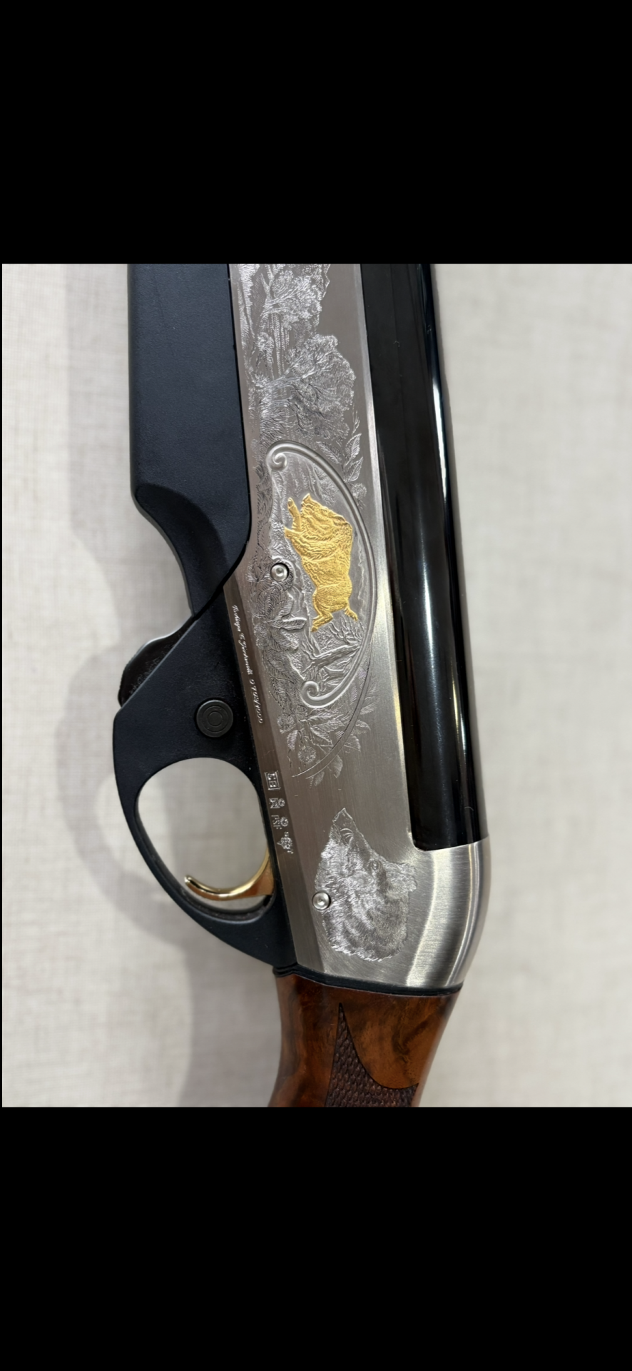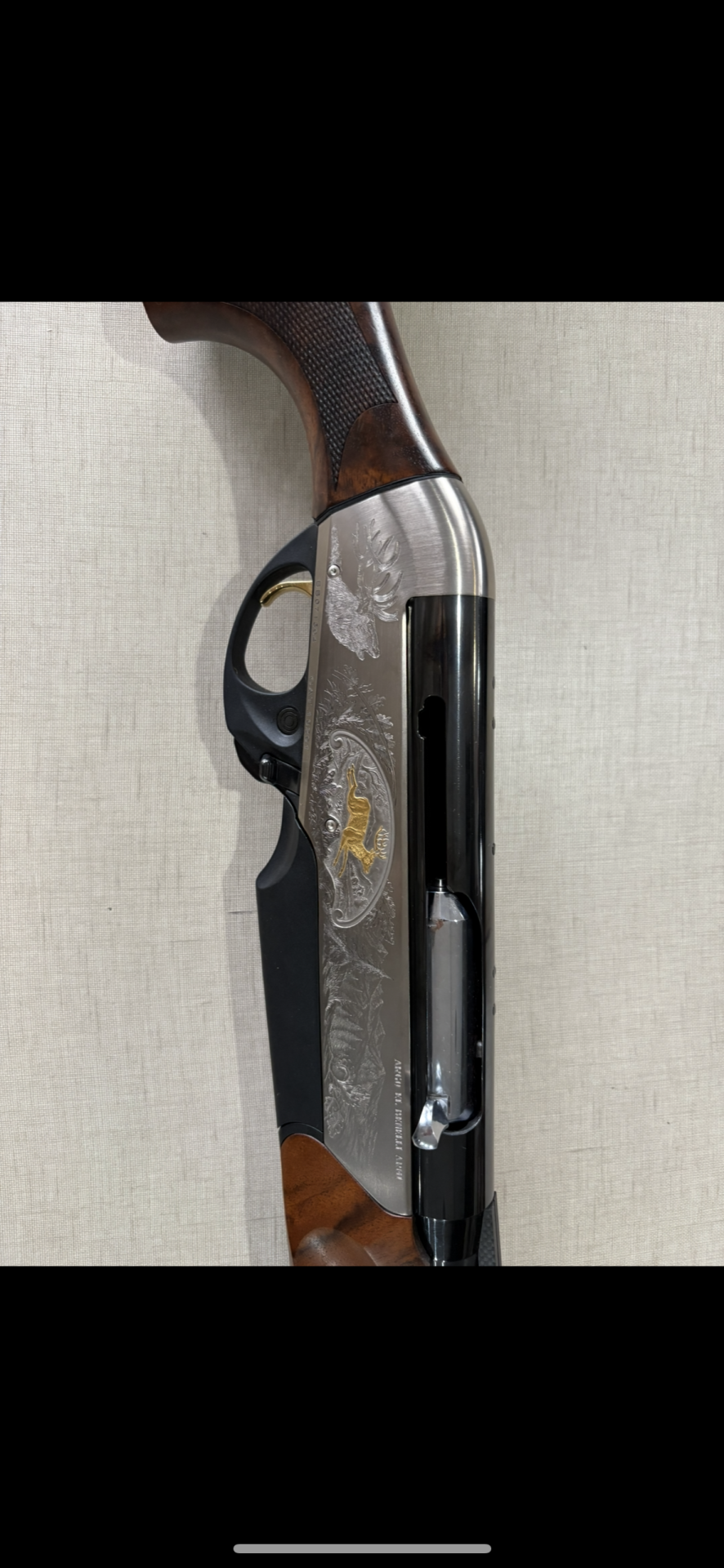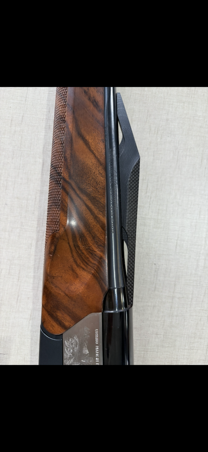 Parte de espingarda com detalhes em madeira, metal e gravuras de animais.