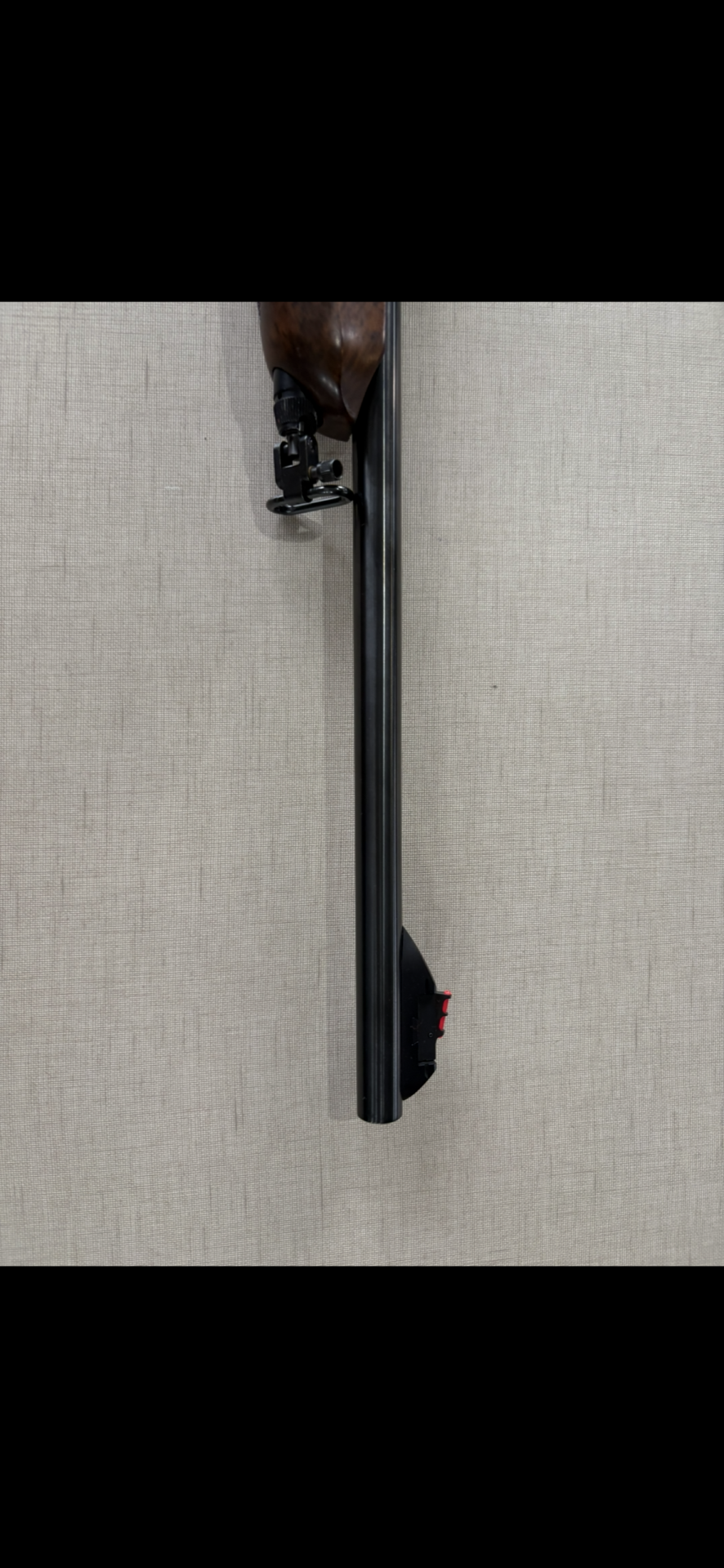 Parte de rifle de cano duplo metálico preto com coronha em madeira castanha e mira traseira