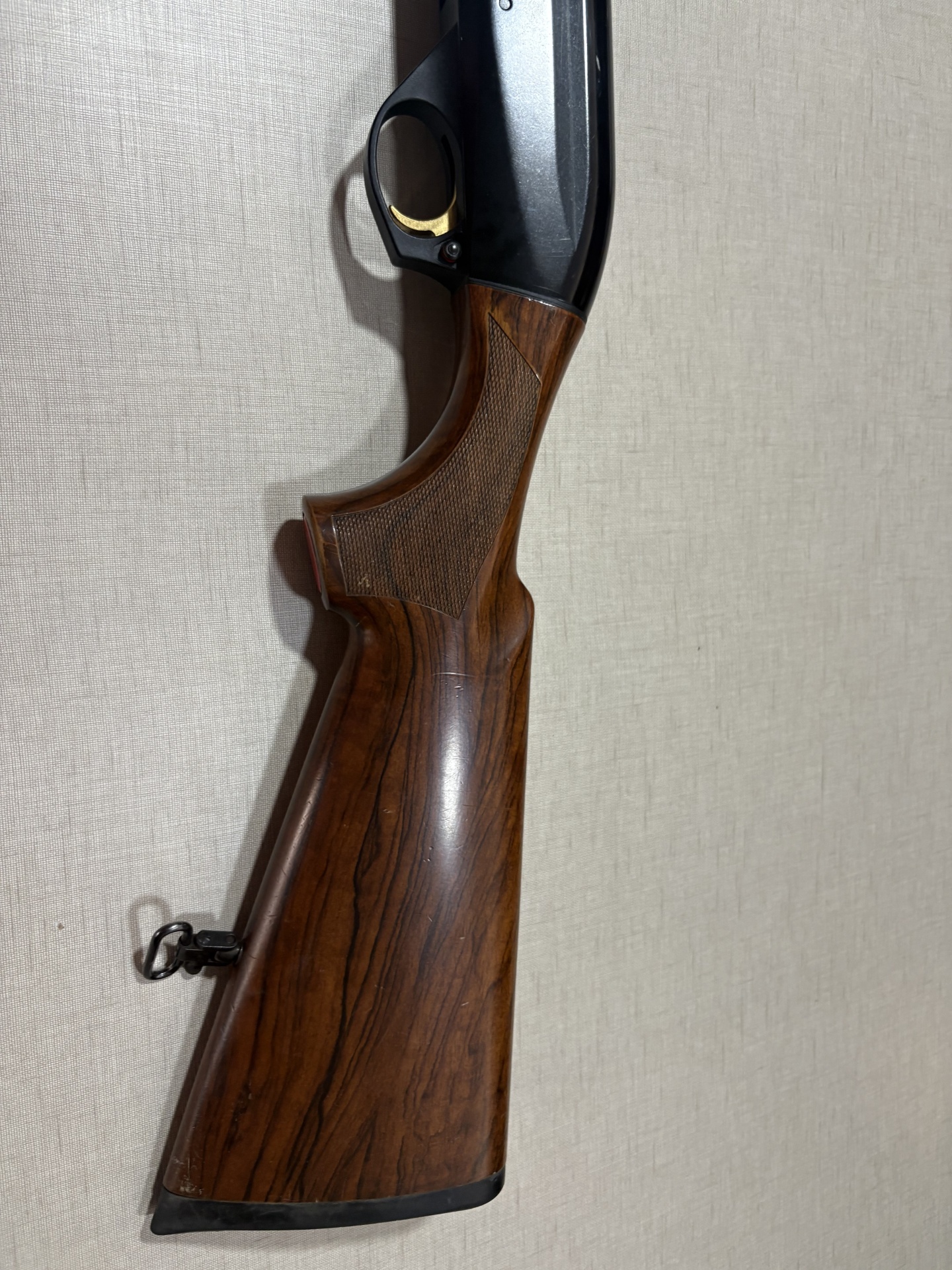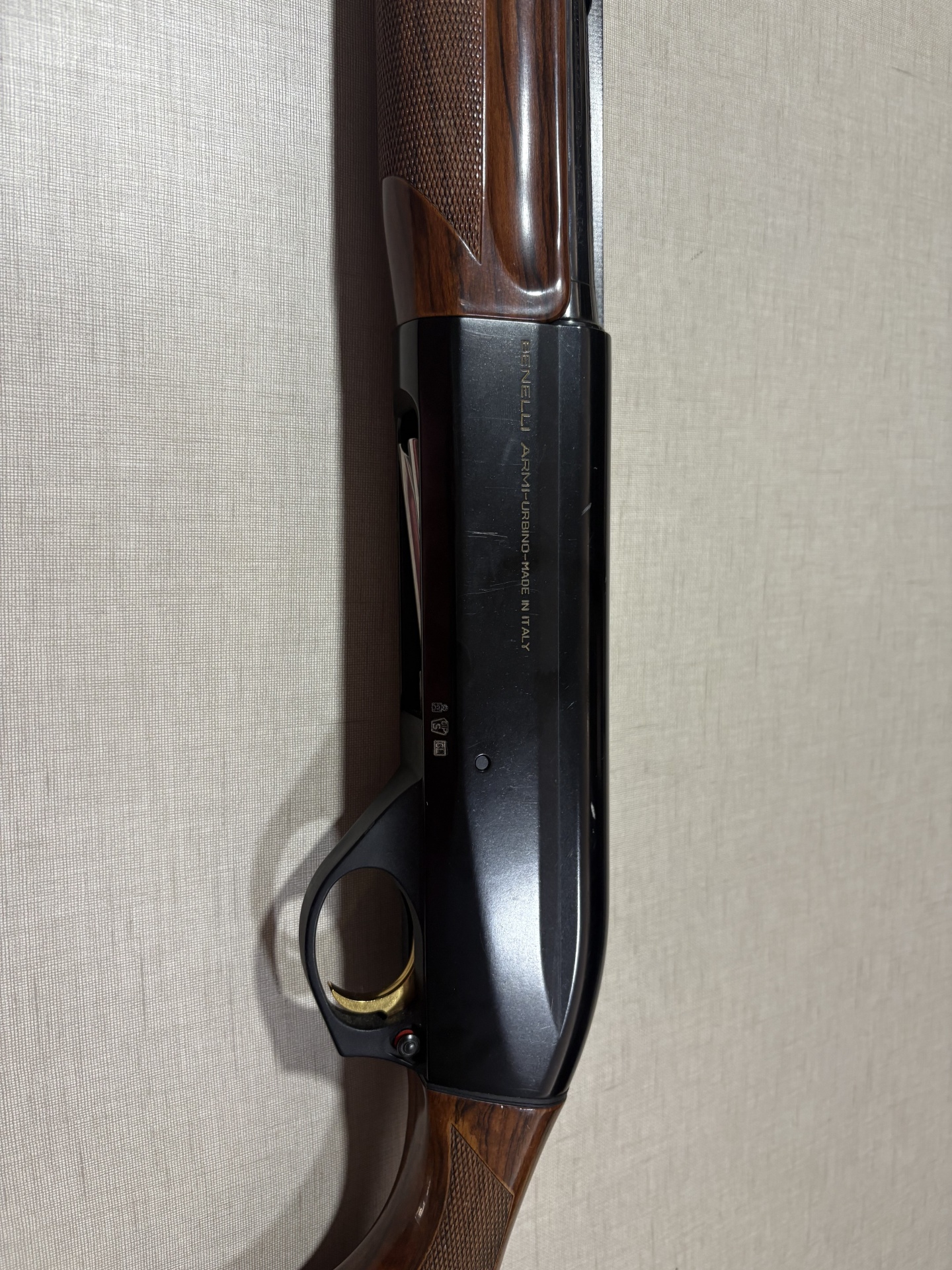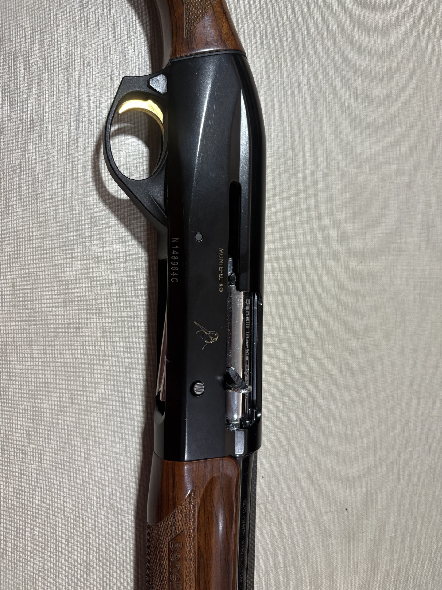 Espingarda com empunhadura em madeira e corpo preto com texto MONTEFELTRO e Benelli Inertia System