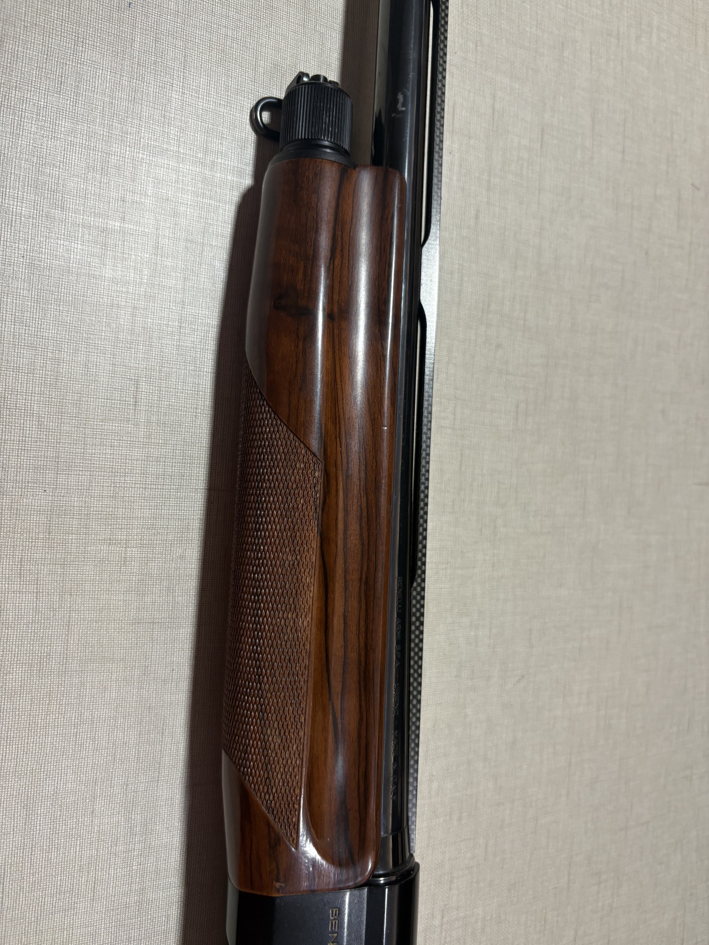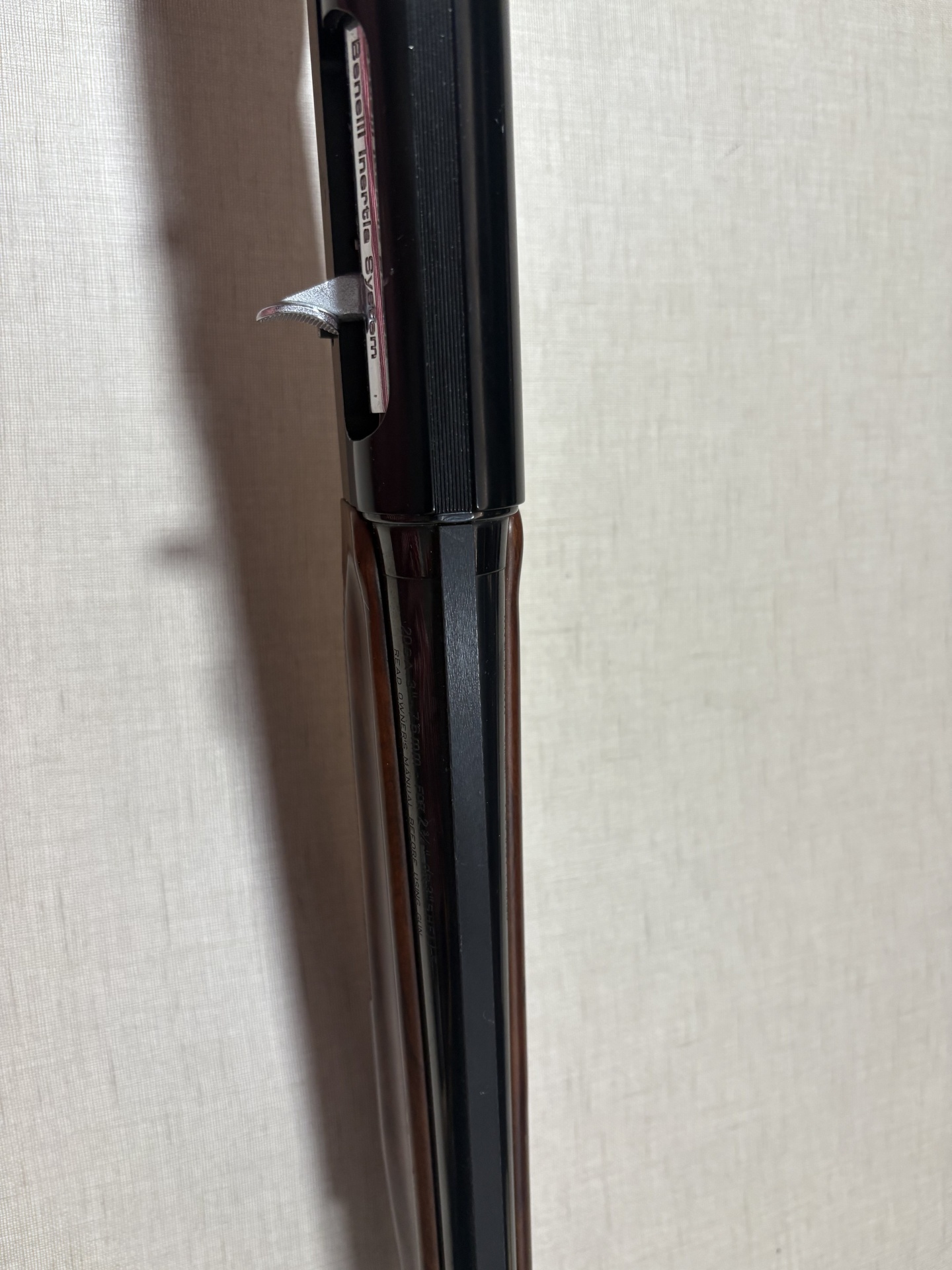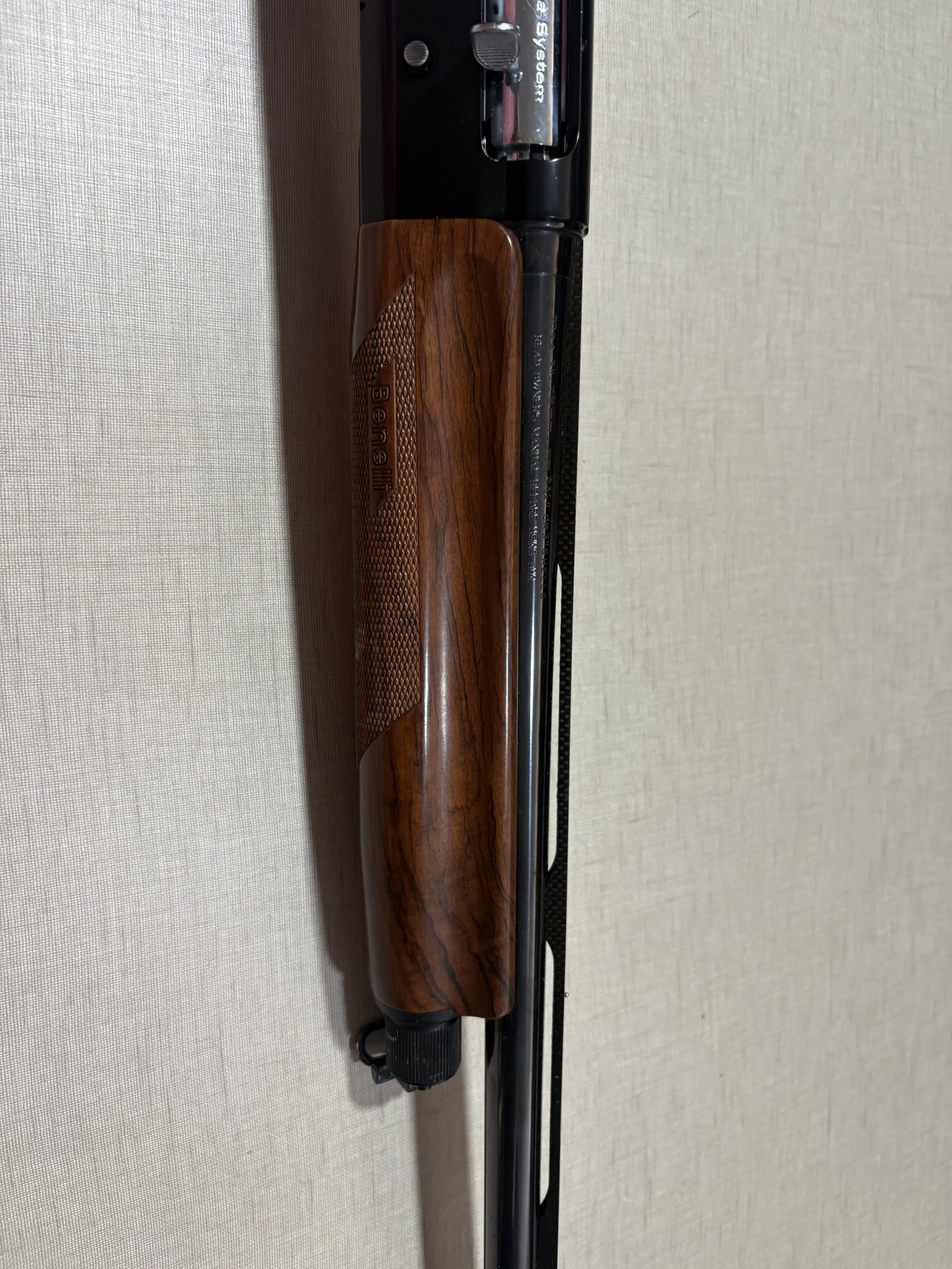 Espingarda com empunhadura em madeira e corpo preto com texto MONTEFELTRO e Benelli Inertia System