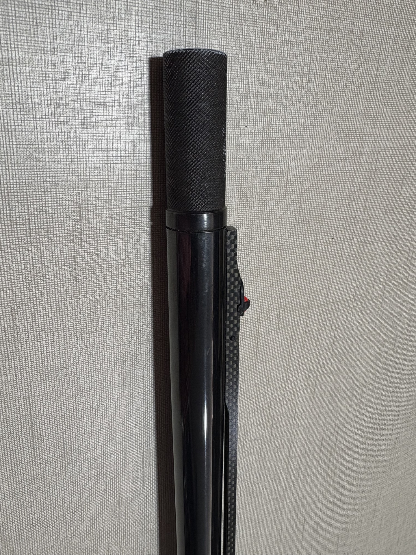 Bastão preto com empunhadura texturada e clip com padrão de fibra de carbono