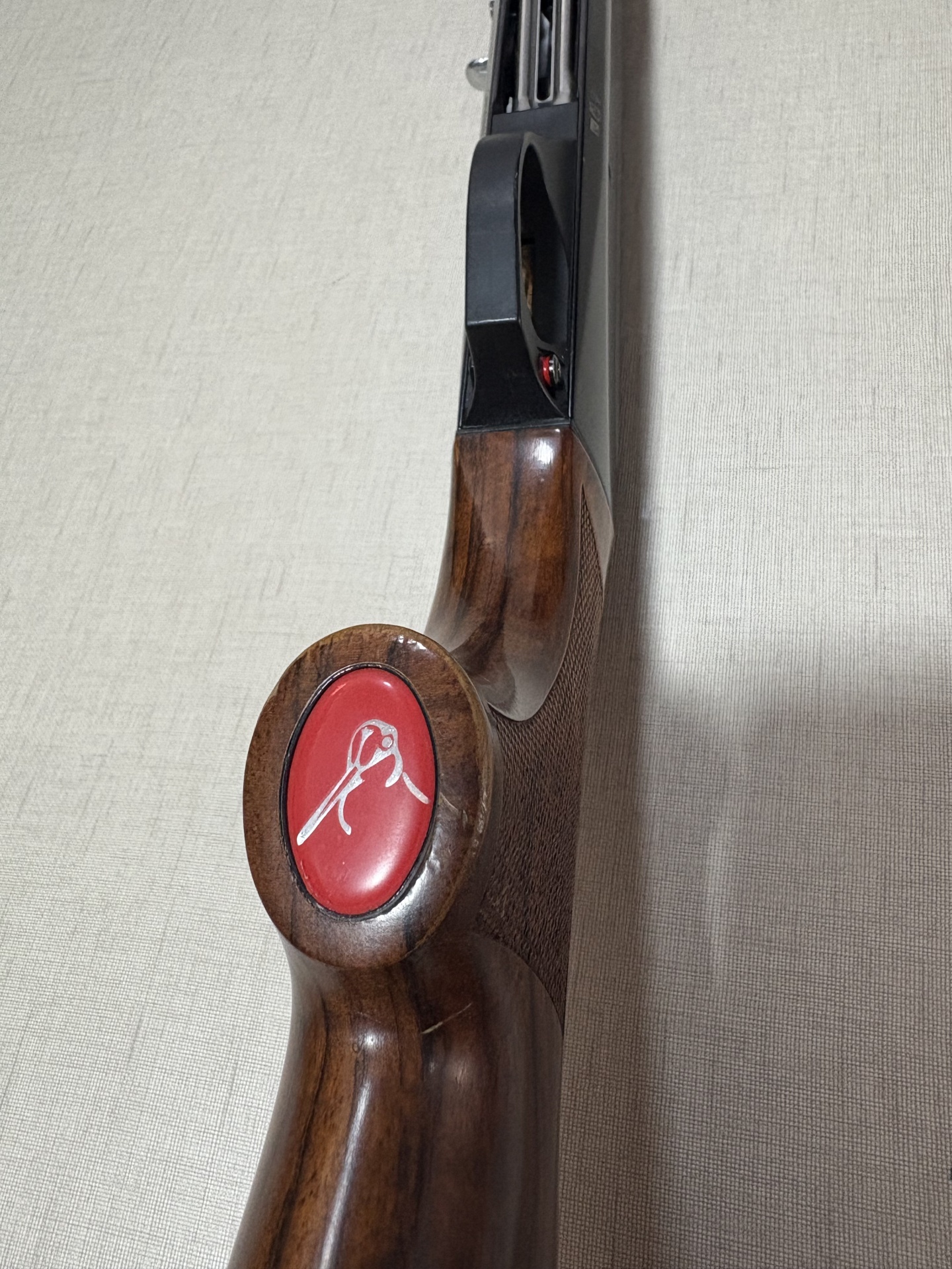 Espingarda com coronha em madeira castanha e detalhe oval vermelho com símbolo branco.