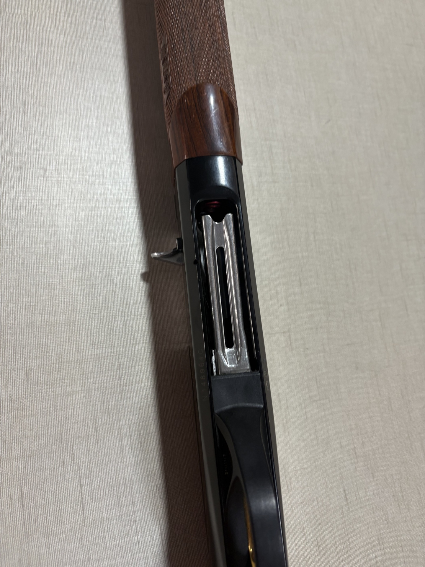 Detalhe de espingarda com metal preto e madeira castanha, gravação BROWNING no metal.
