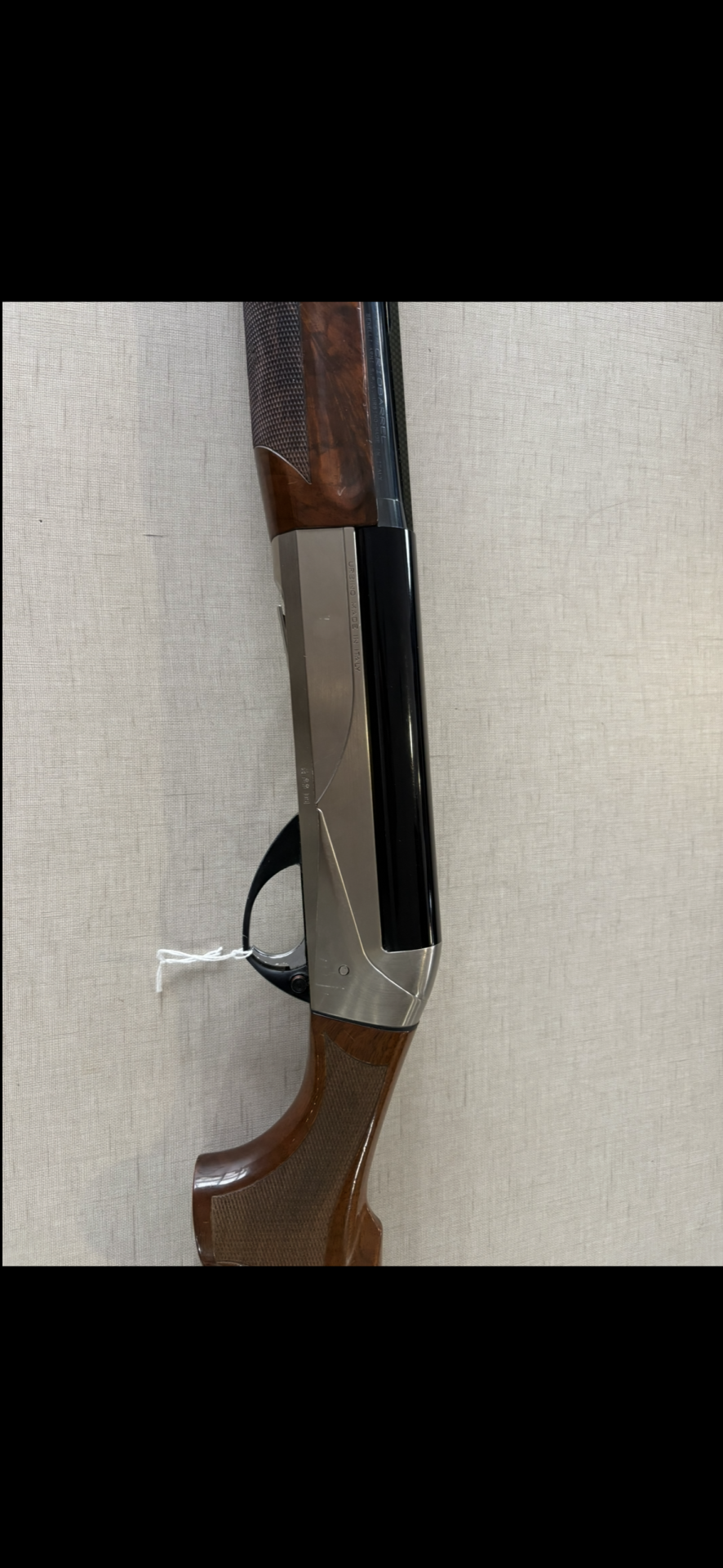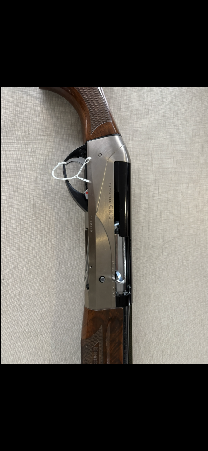 Espingarda com empunhadura em madeira castanha e corpo metálico prateado com texto RAFFAELLO CRIO