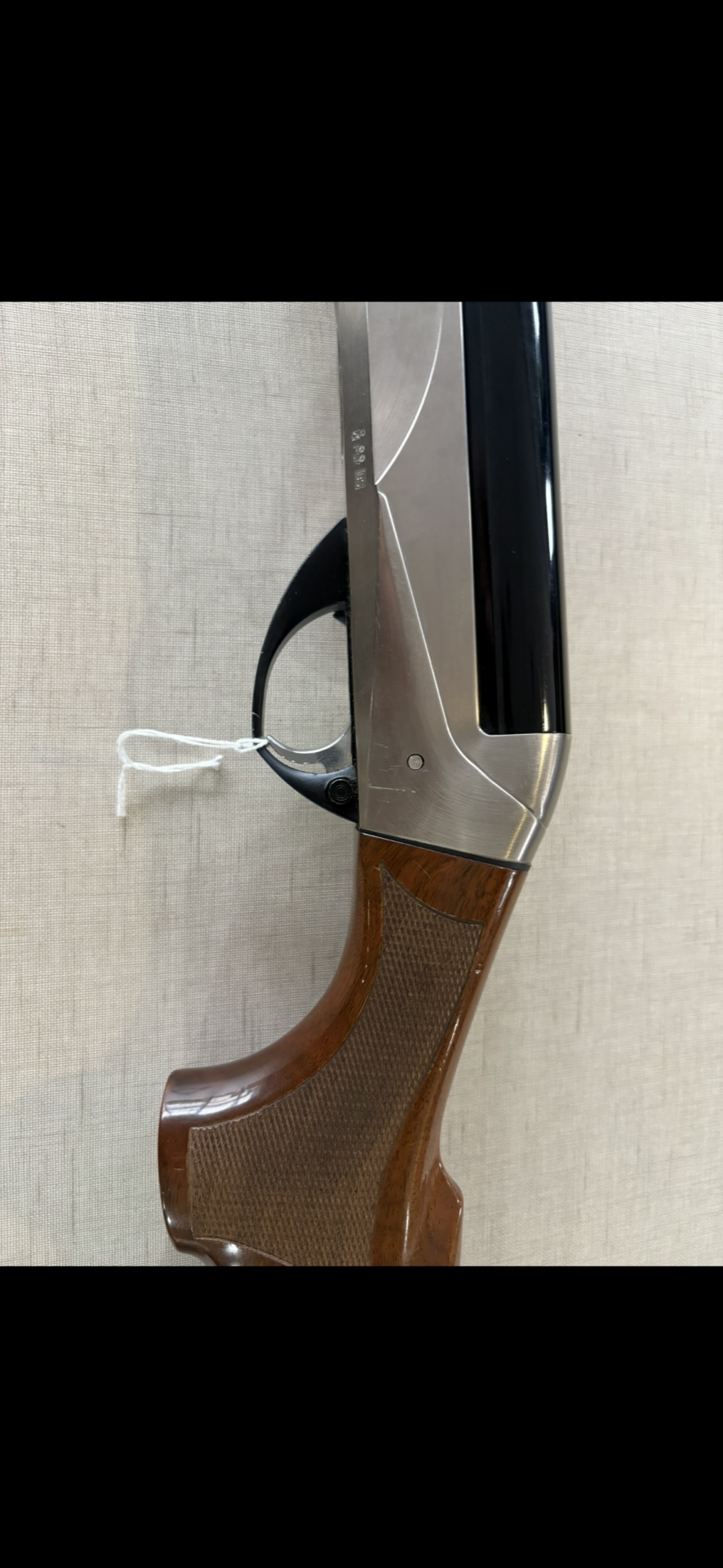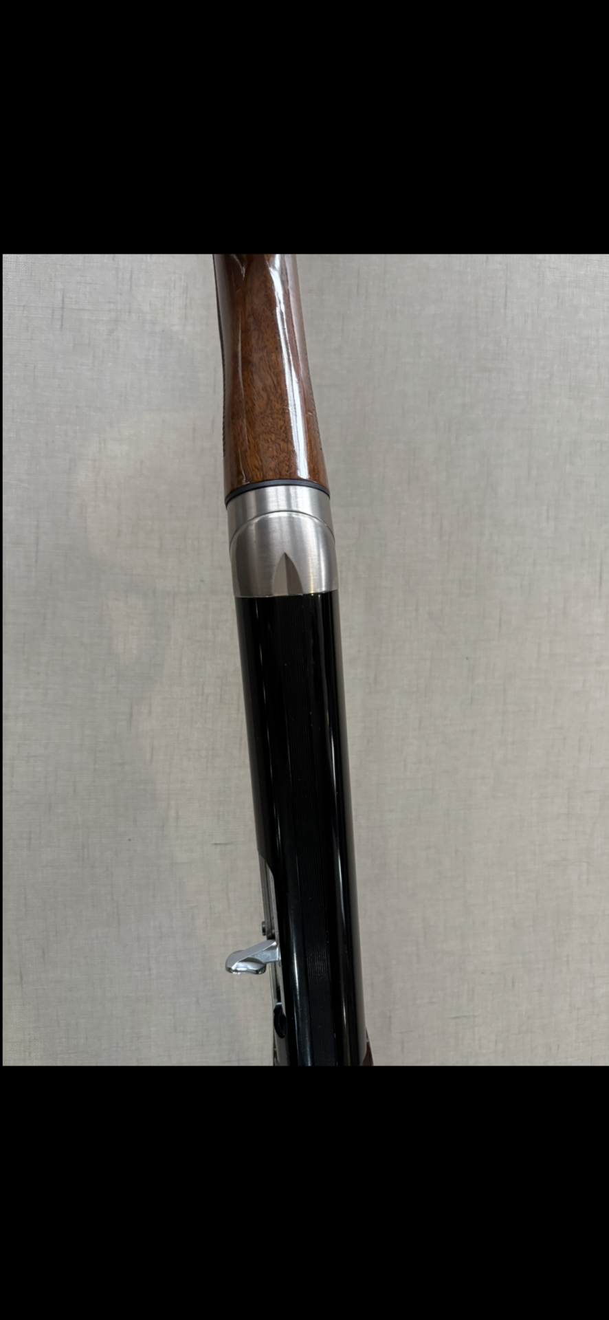 Espingarda de caça com coronha em madeira e cano preto, sobre fundo bege