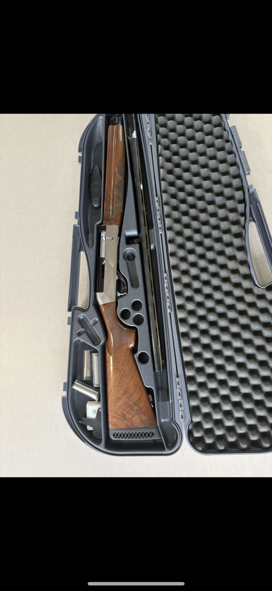 Caixa rígida preta com estojo acolchoado e caçadeira desmontada