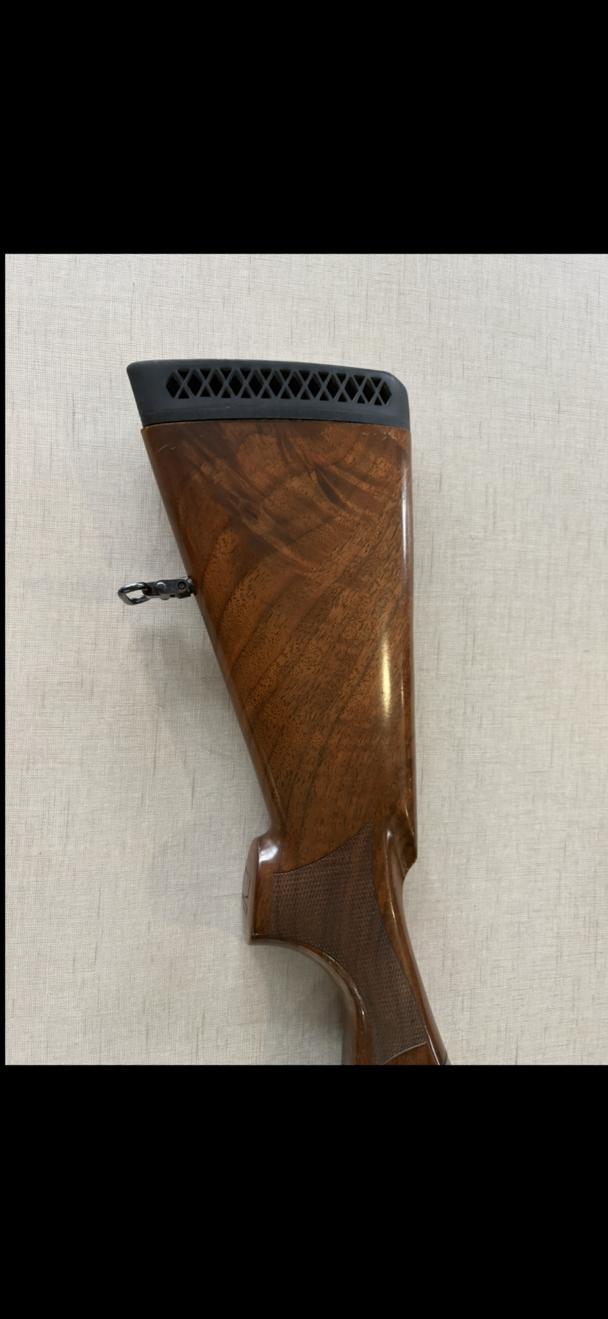Coronha de espingarda em madeira polida com reforço de borracha e puxador metálico