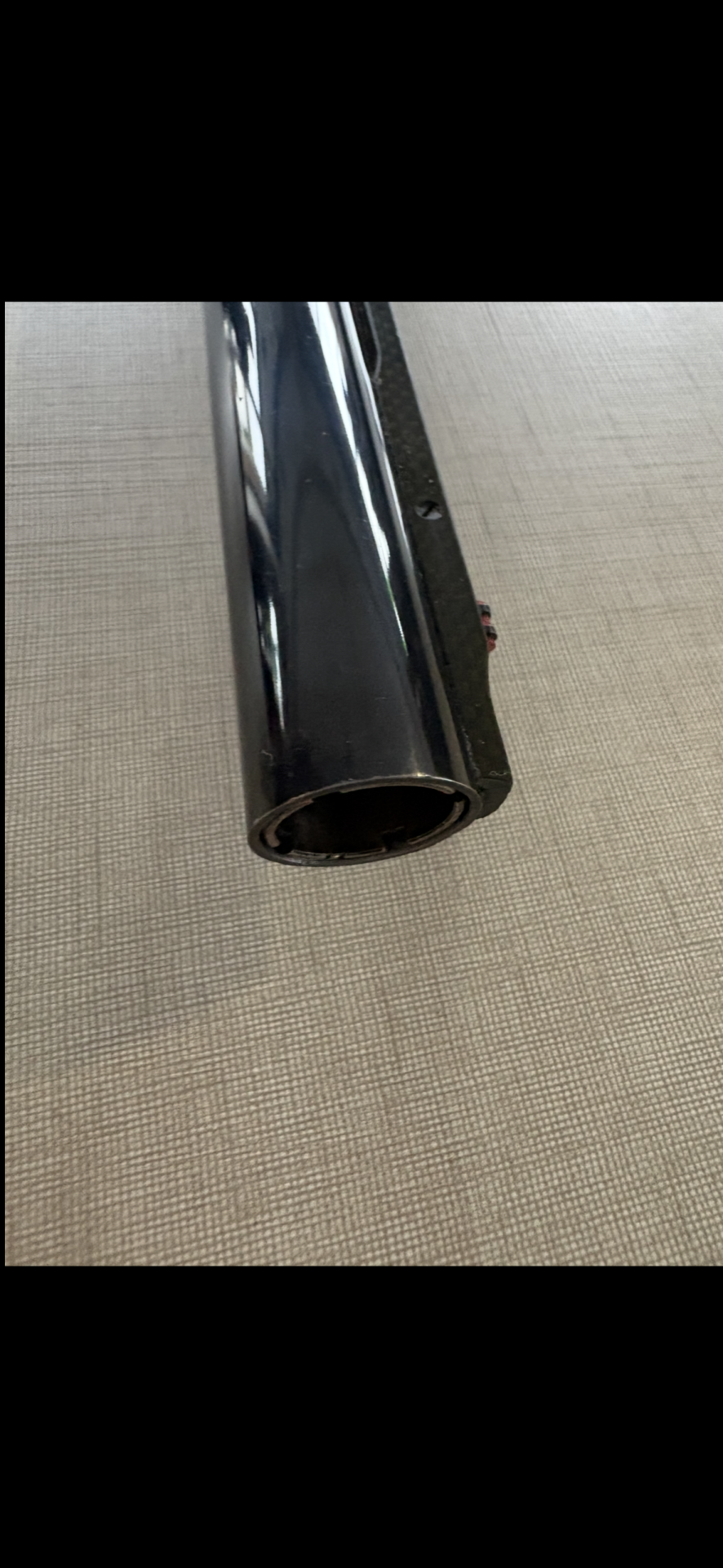 Tubo cilíndrico preto brilhante sobre superfície bege quadriculada