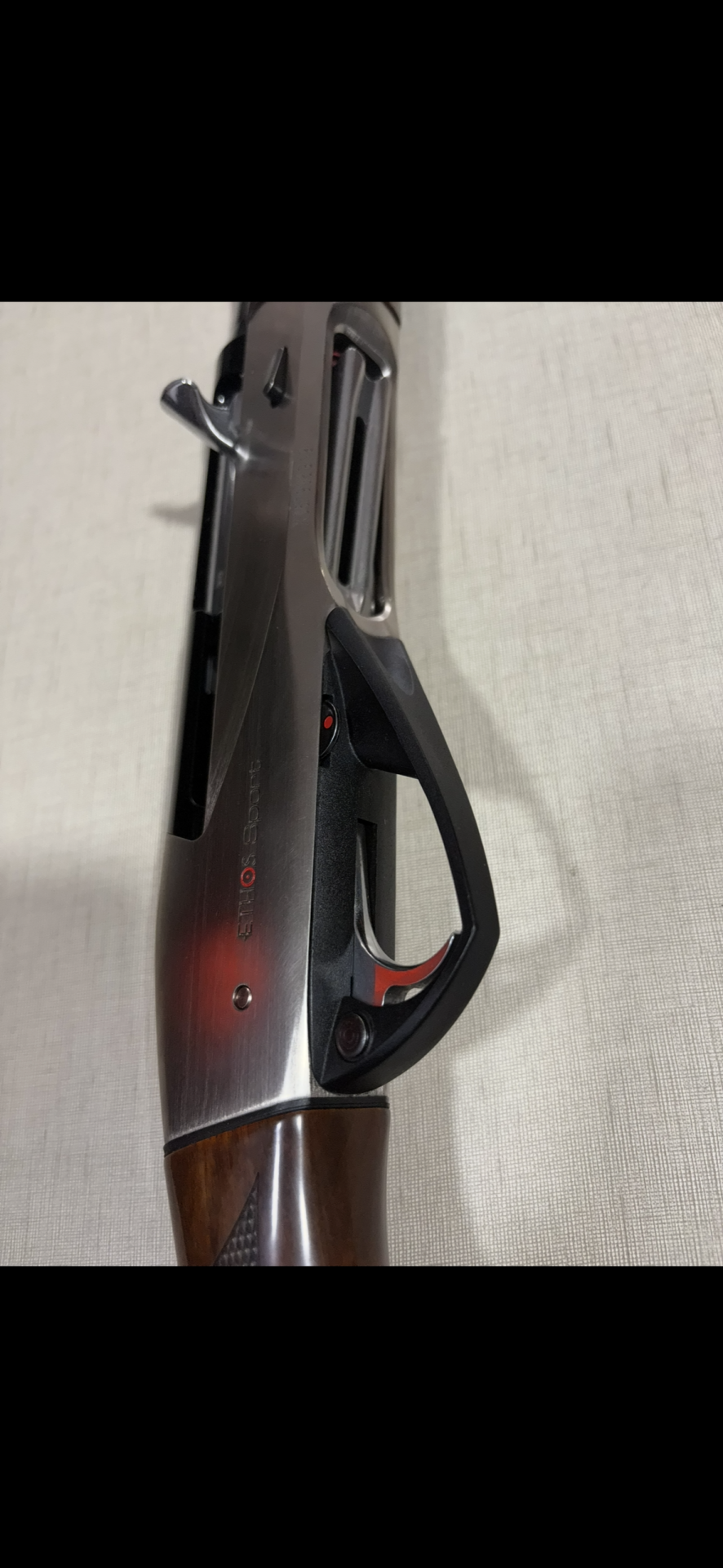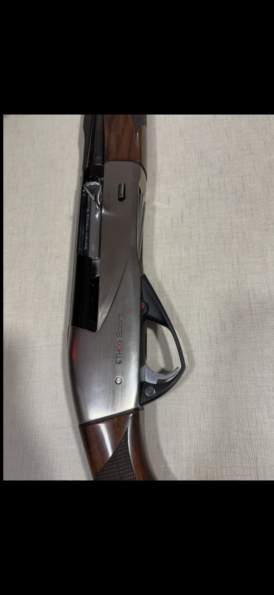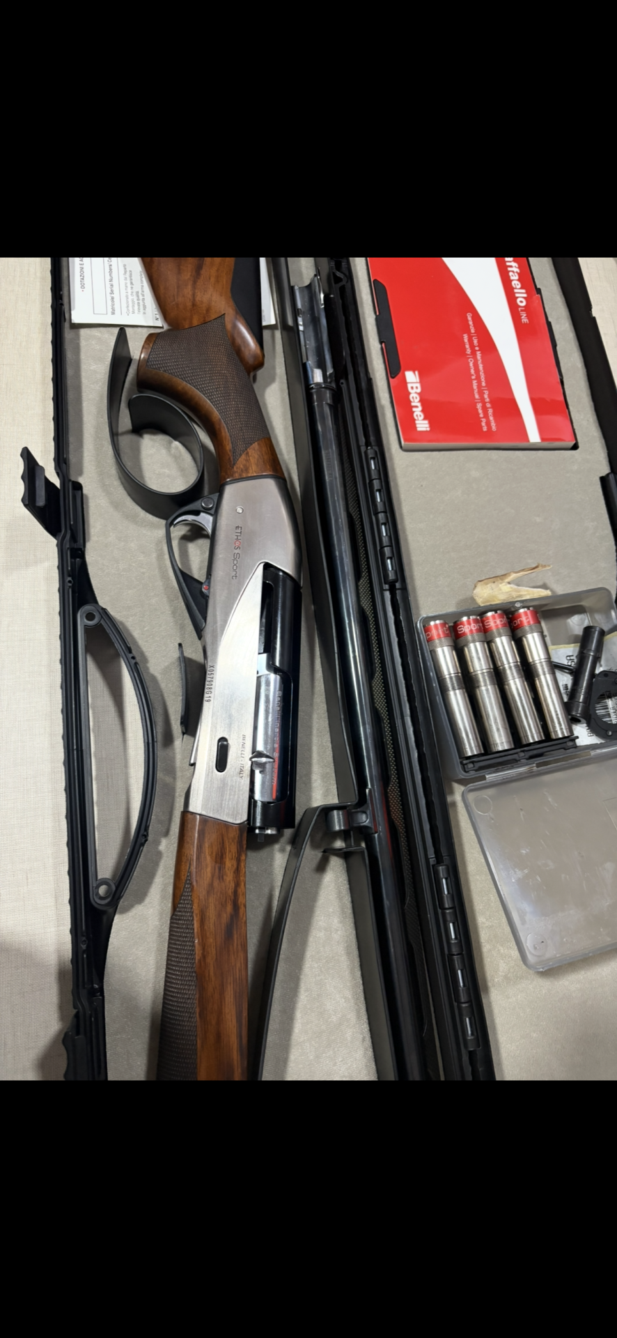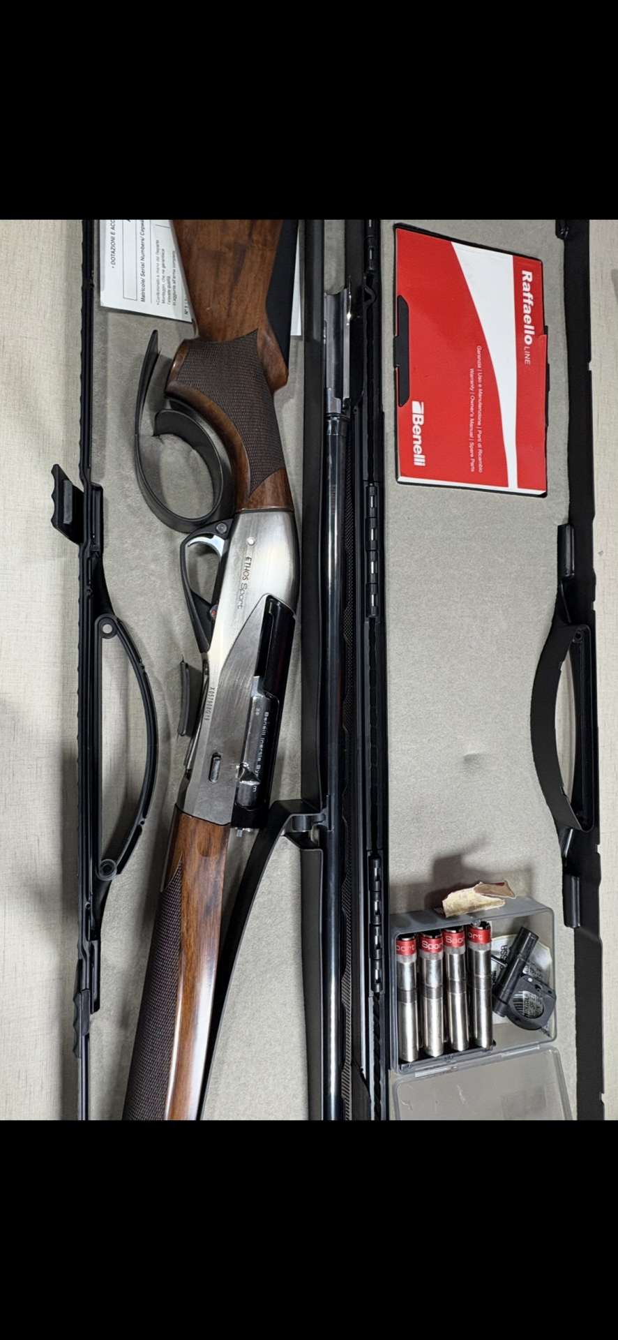 Espingarda Benelli Ethos Sport em caixa com manual vermelho e cartuchos.