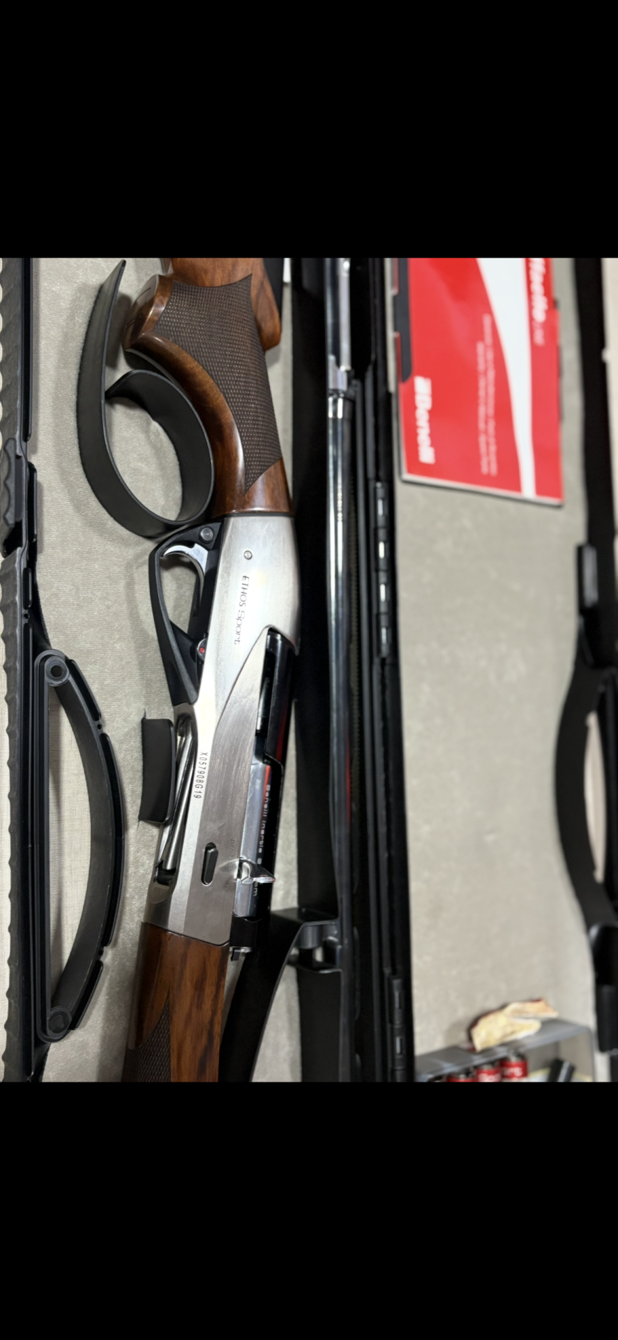 Espingarda de caça Benelli ETHOS Sport com acessórios e cartuchos, em estojo aberto.