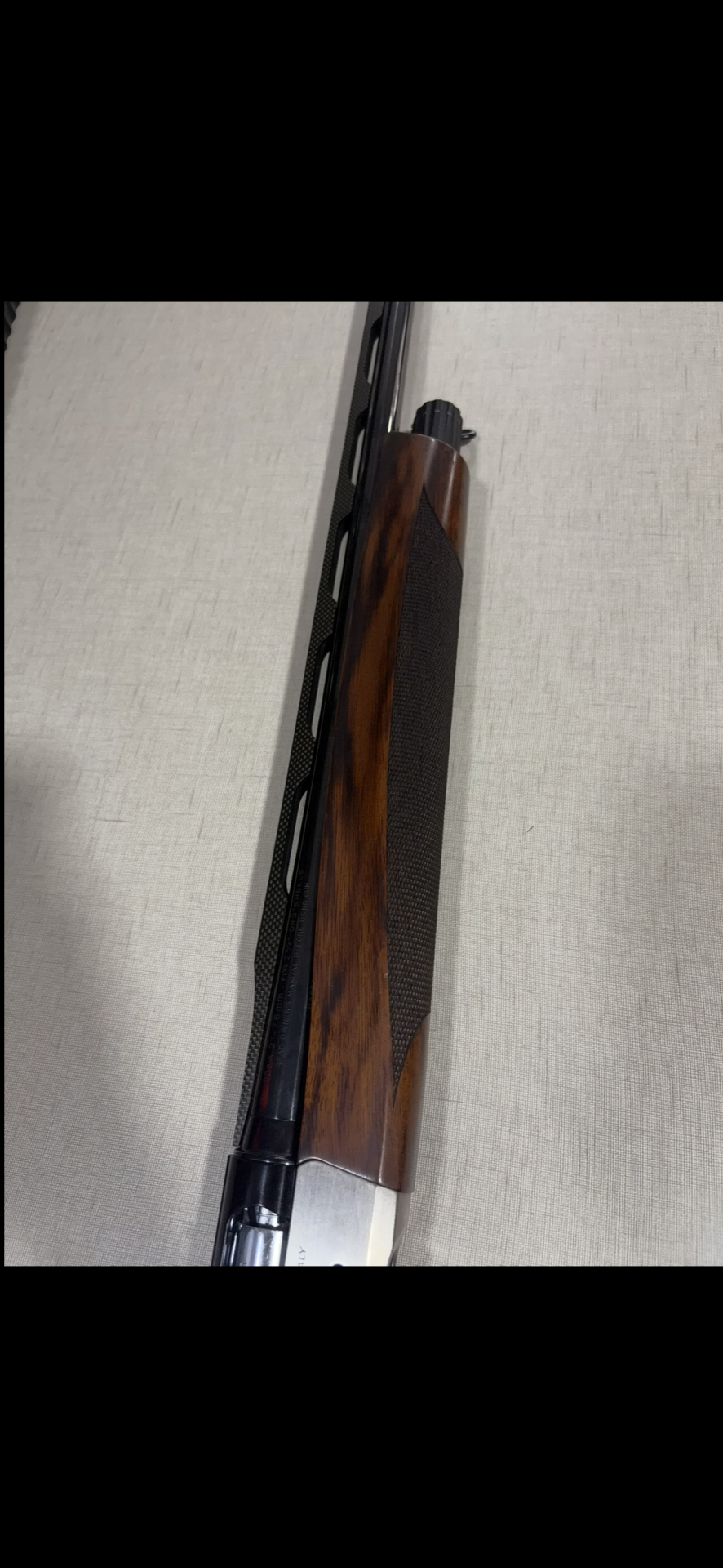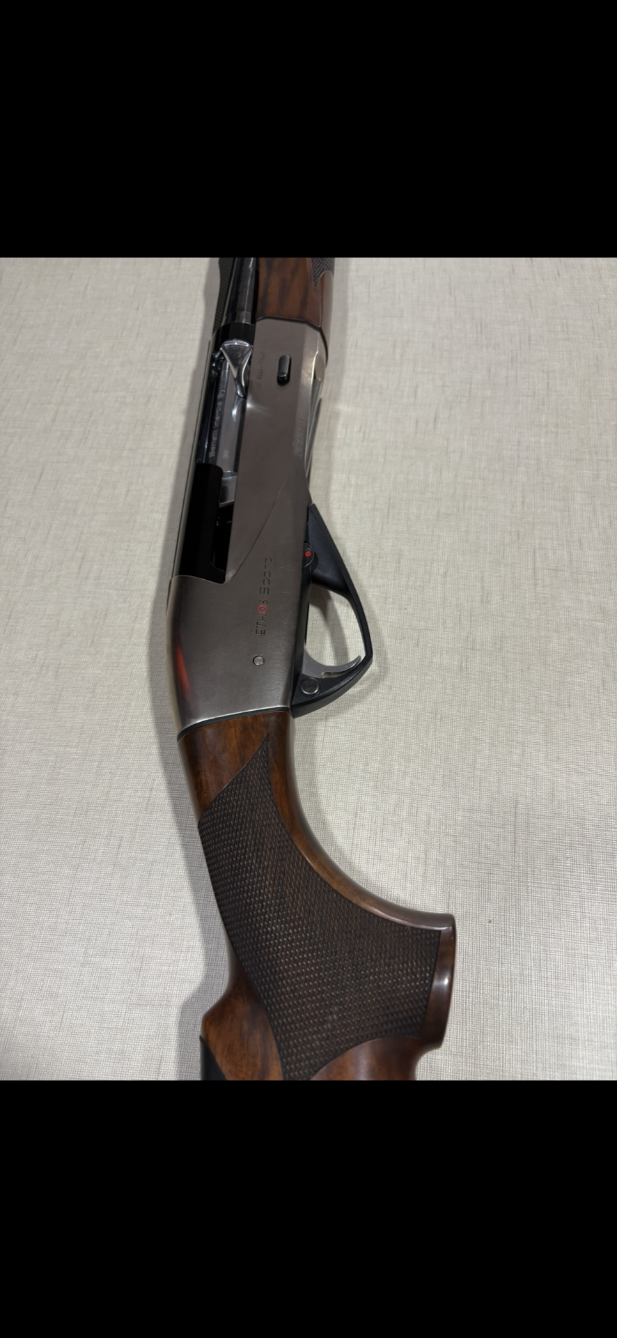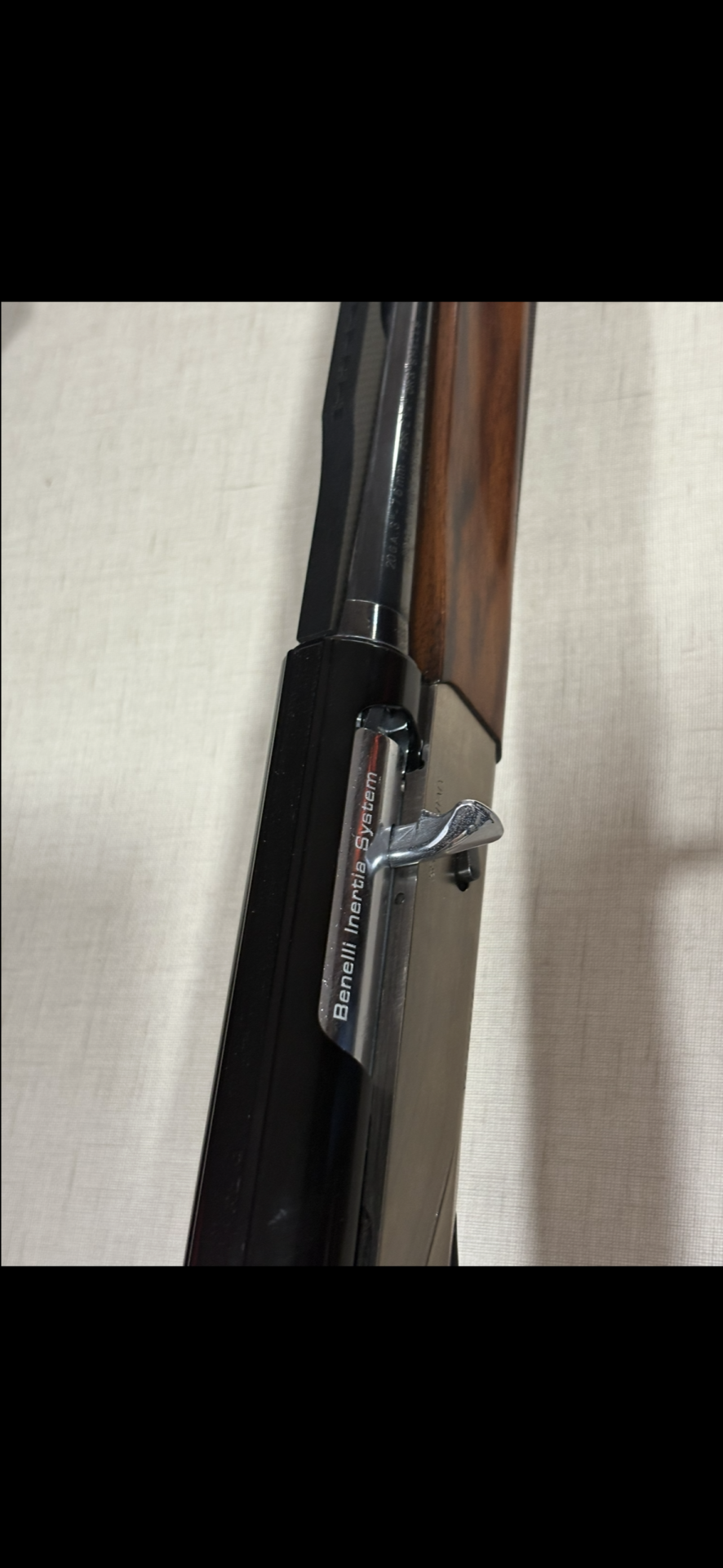 Parte de espingarda com madeira castanha, metal preto, alavanca prateada e texto Benelli Inertia System.