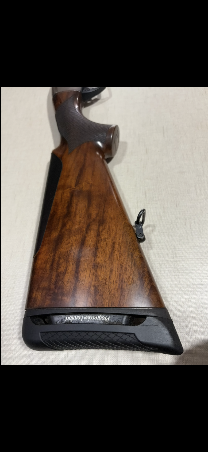 Coronha de arma com madeira castanha e detalhe em borracha preta com texto