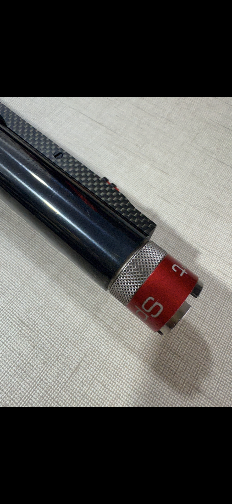Detalhe de objeto cilíndrico preto com anel vermelho e acabamento metálico prateado.