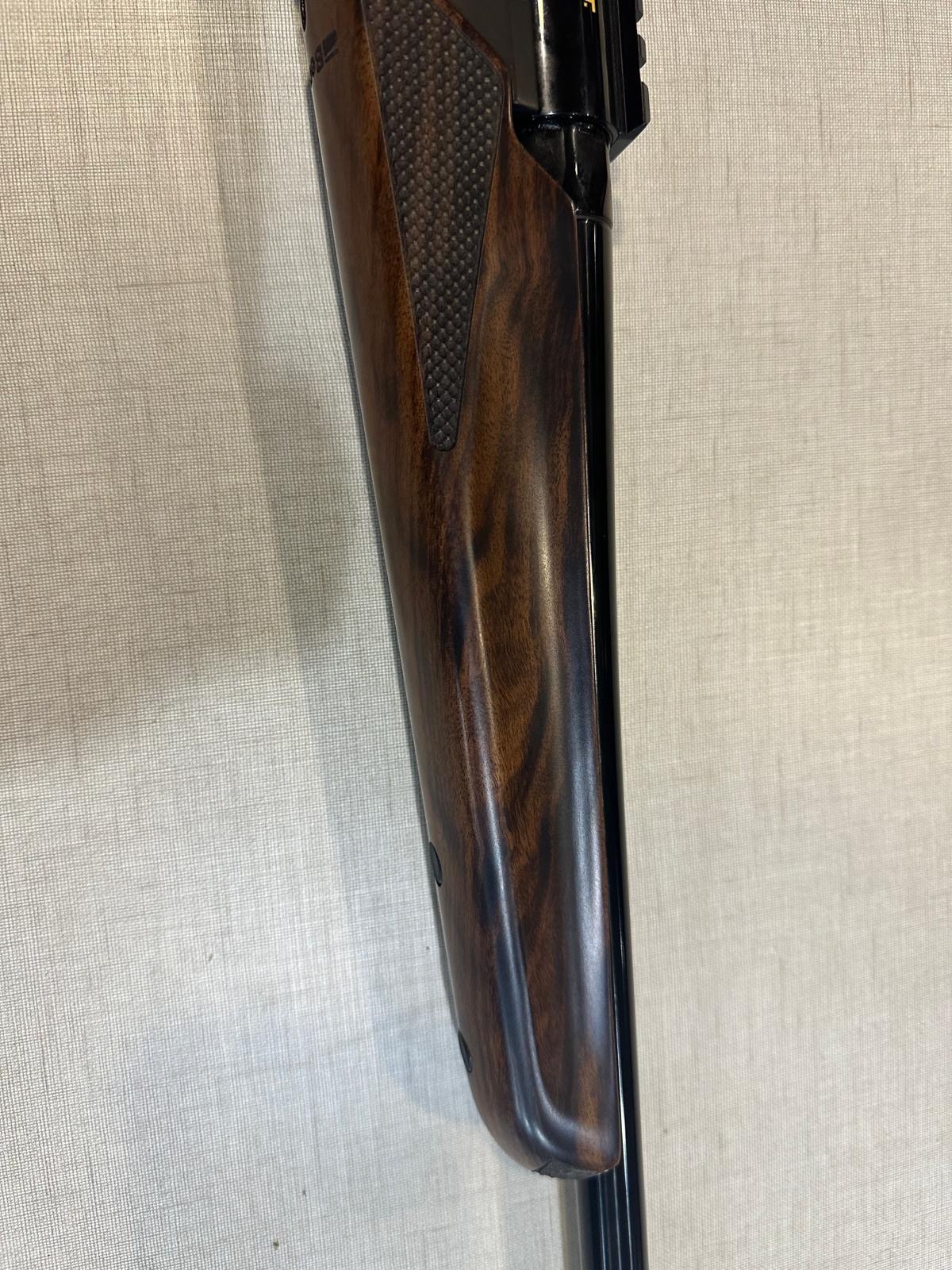 Espingarda com coronha em madeira castanha polida e parte superior preta com inscrições douradas.