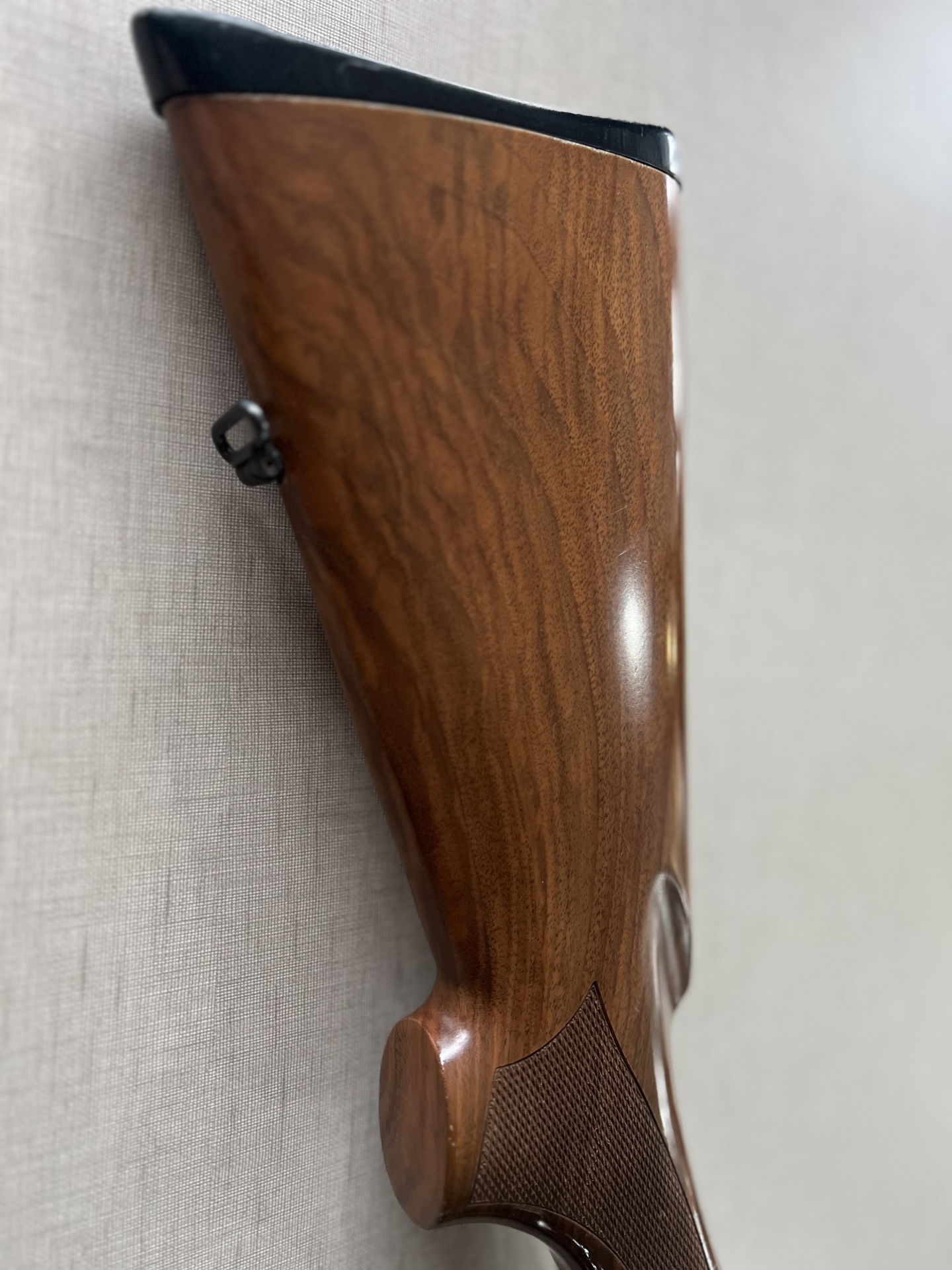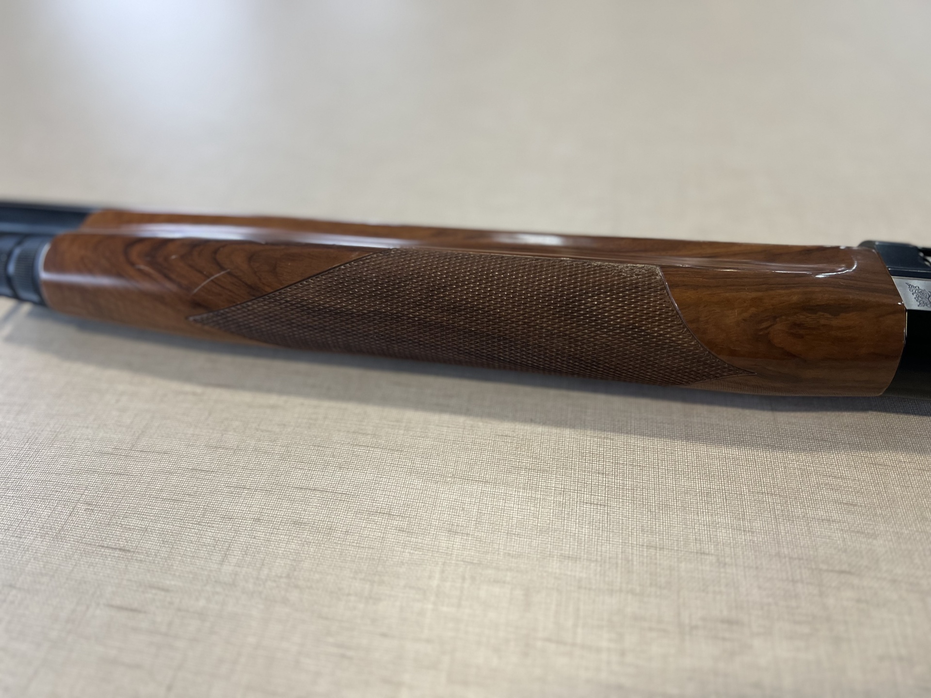 Coronha de espingarda de madeira polida com textura antiderrapante e extremidade metálica