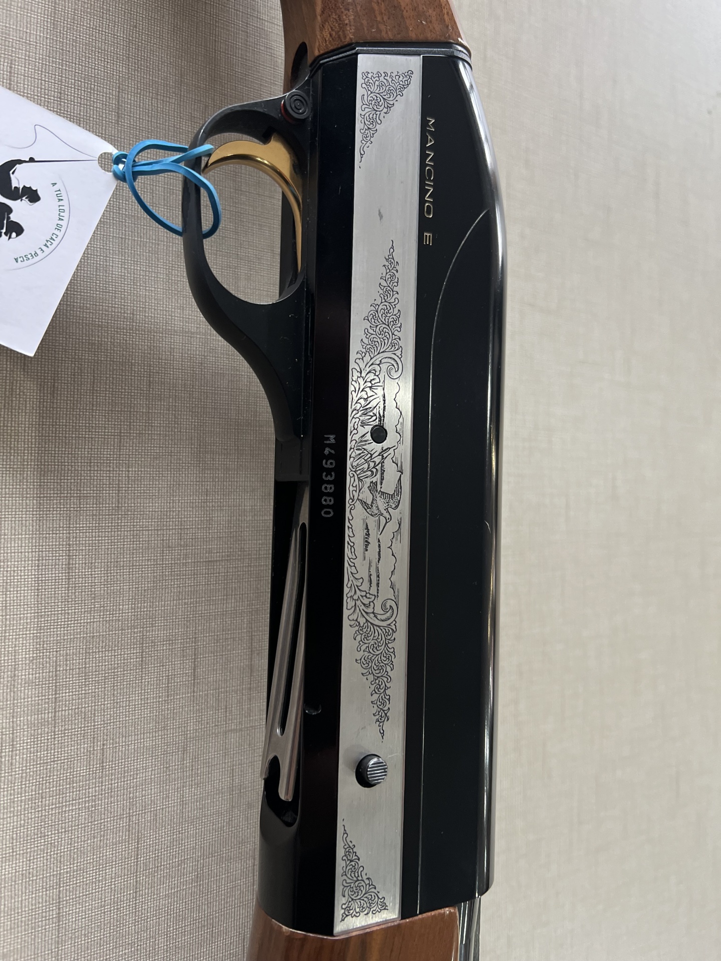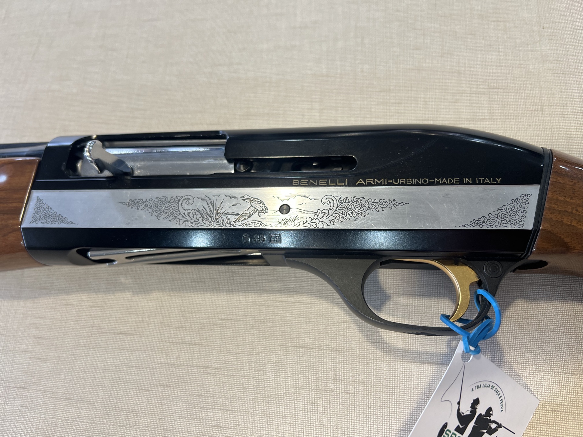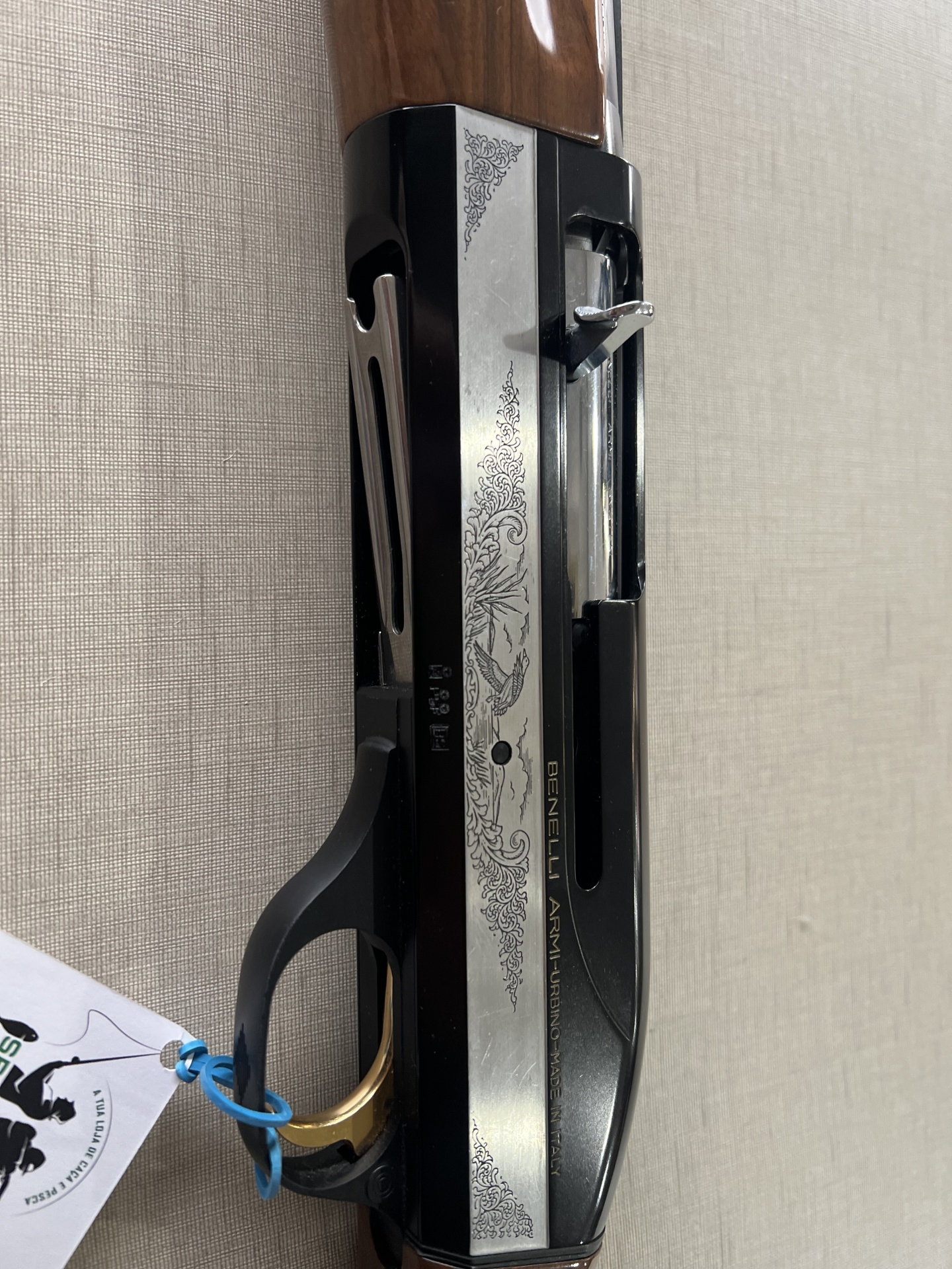 Arma de fogo com madeira e metal preto com detalhes gravados e etiqueta pendurada.