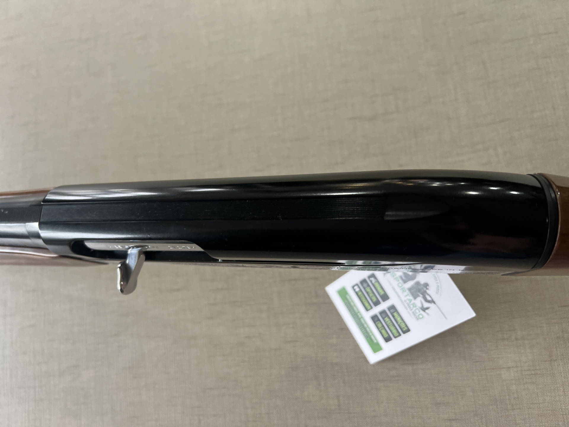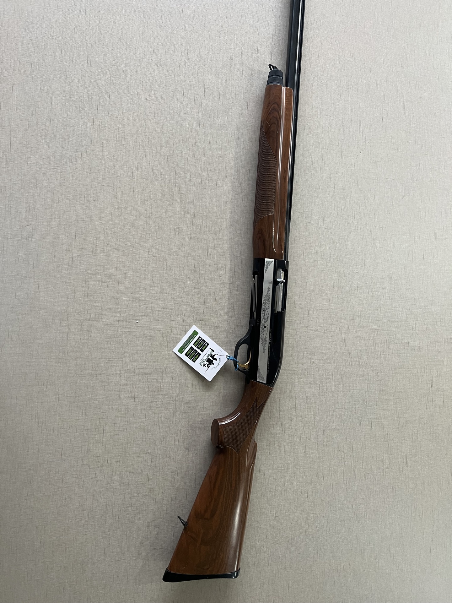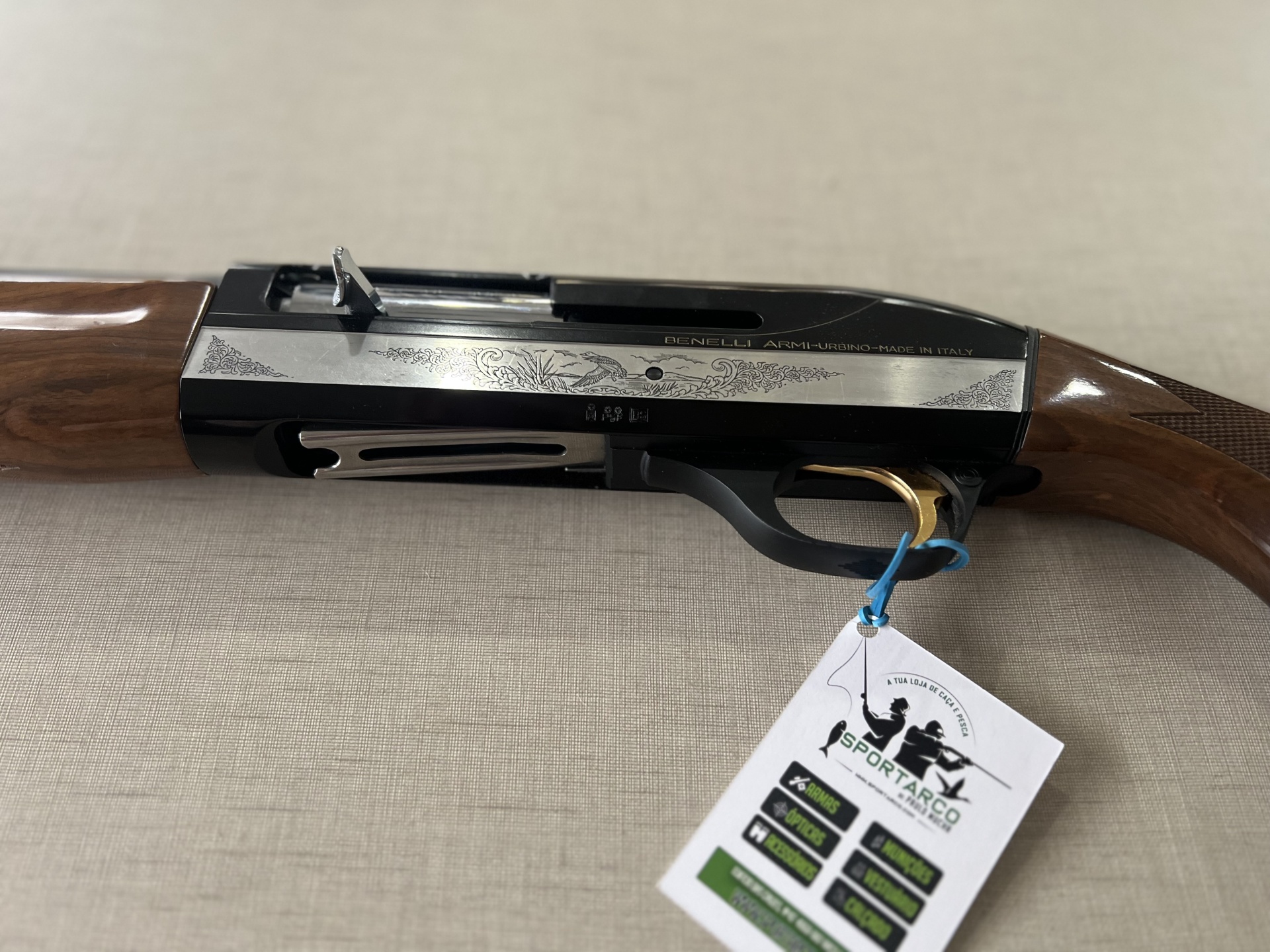 Arma de fogo com madeira e metal preto com detalhes gravados e etiqueta pendurada.