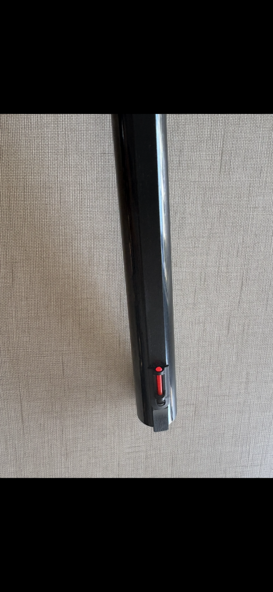 Mira dianteira vermelha em arma de fogo preta contra fundo bege texturizado
