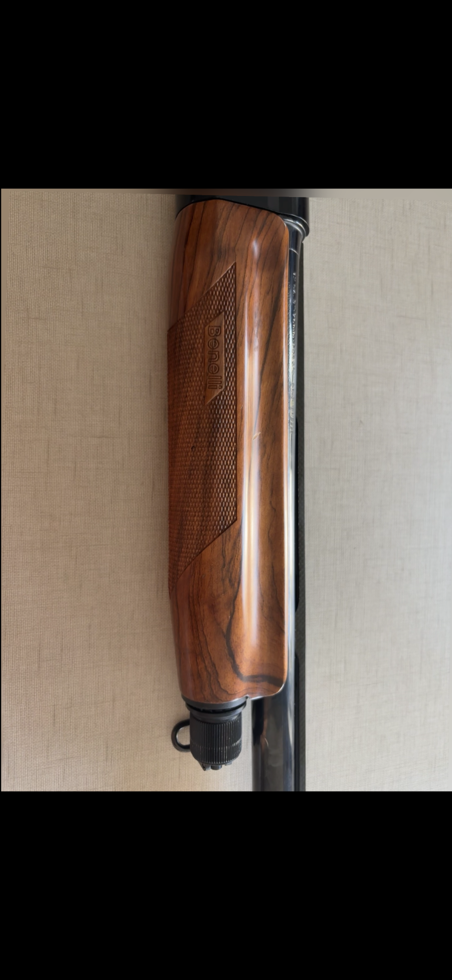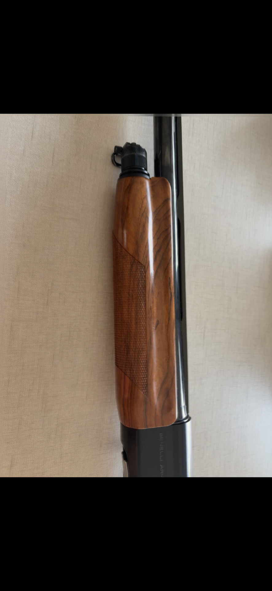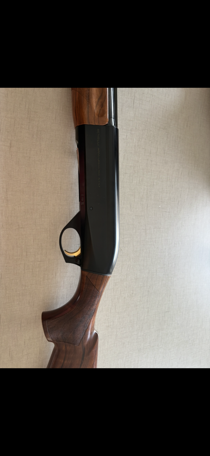 Espingarda com punho em madeira e acabamento preto com texto Benelli Armi