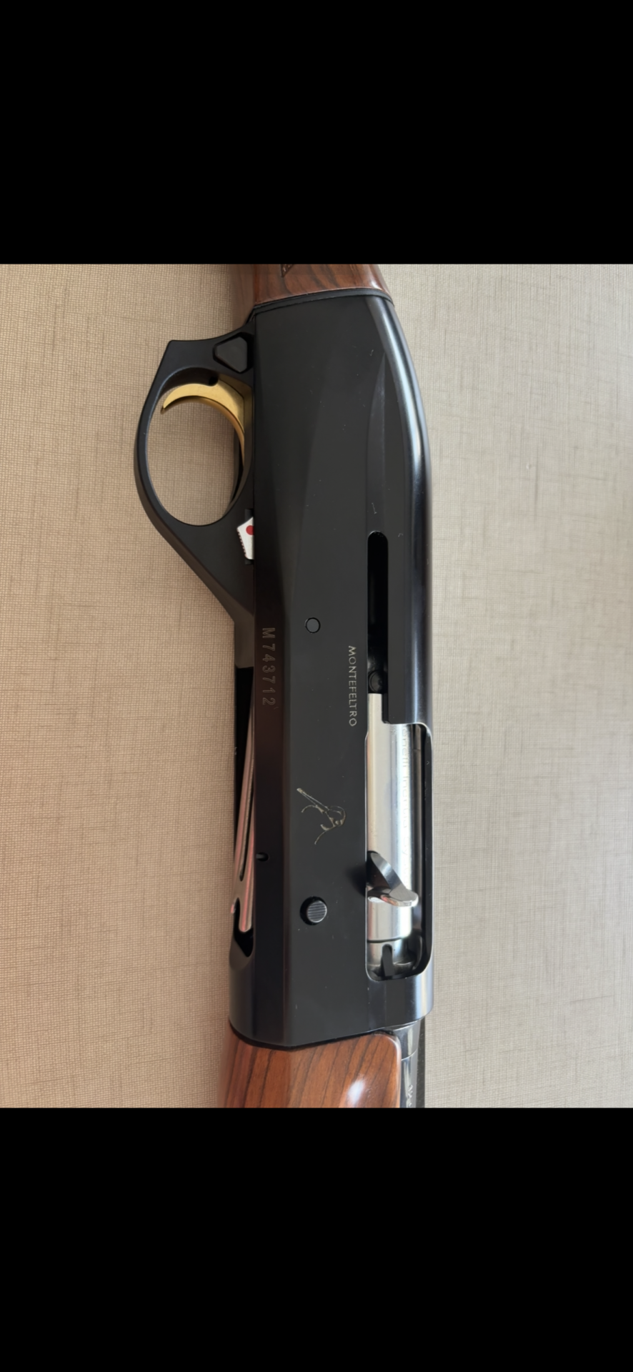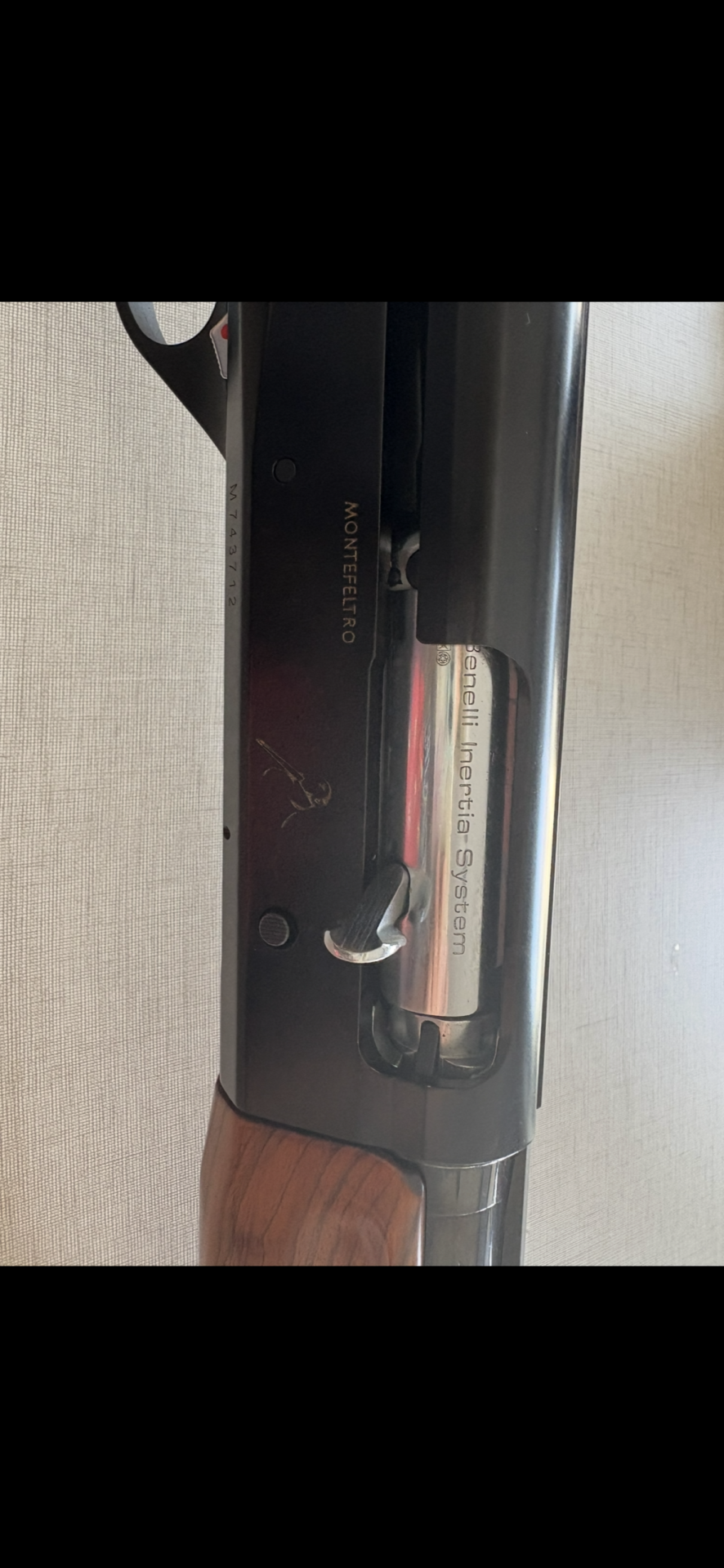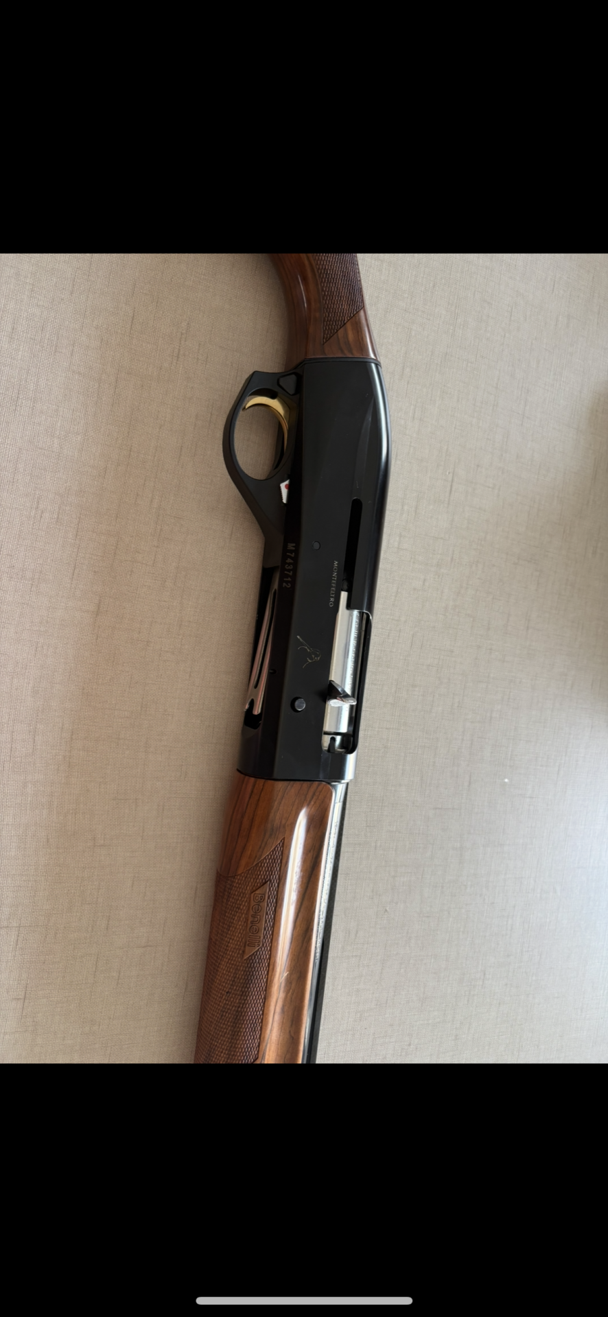 Espingarda com punho em madeira e acabamento preto com texto Benelli Armi